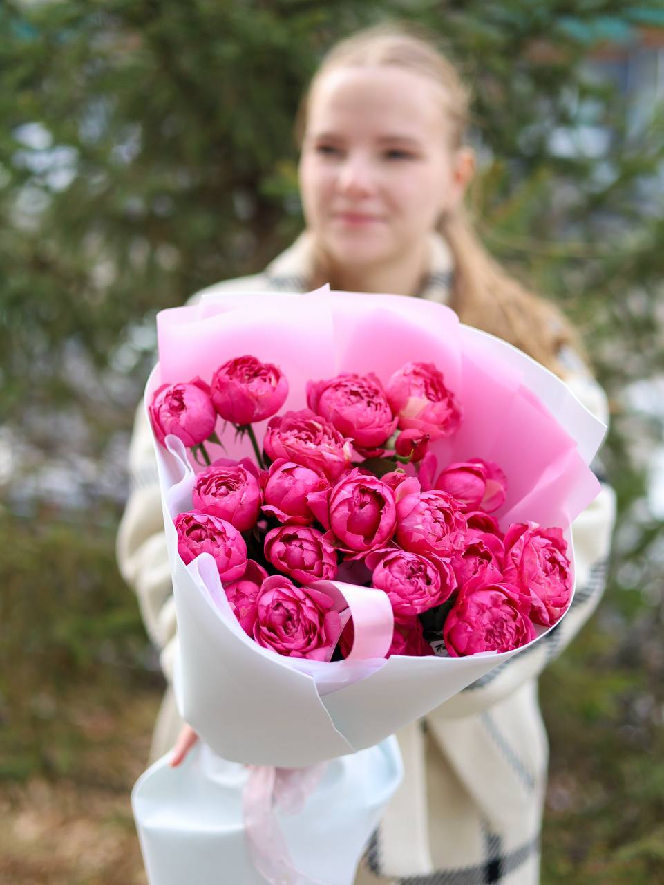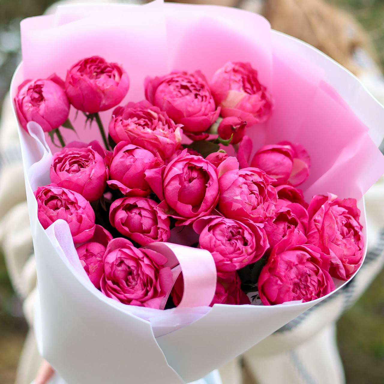 Букет из 5 веток кустовых пионовидных роз в оформлении.
