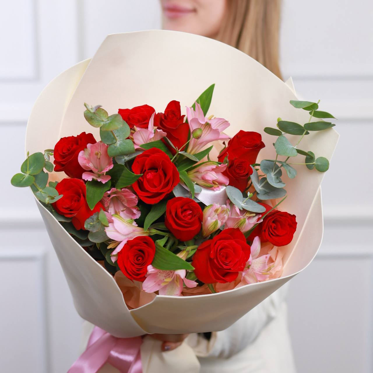 Букет роз, стойкой альстромерии и душистого эвкалипта в оформлении.