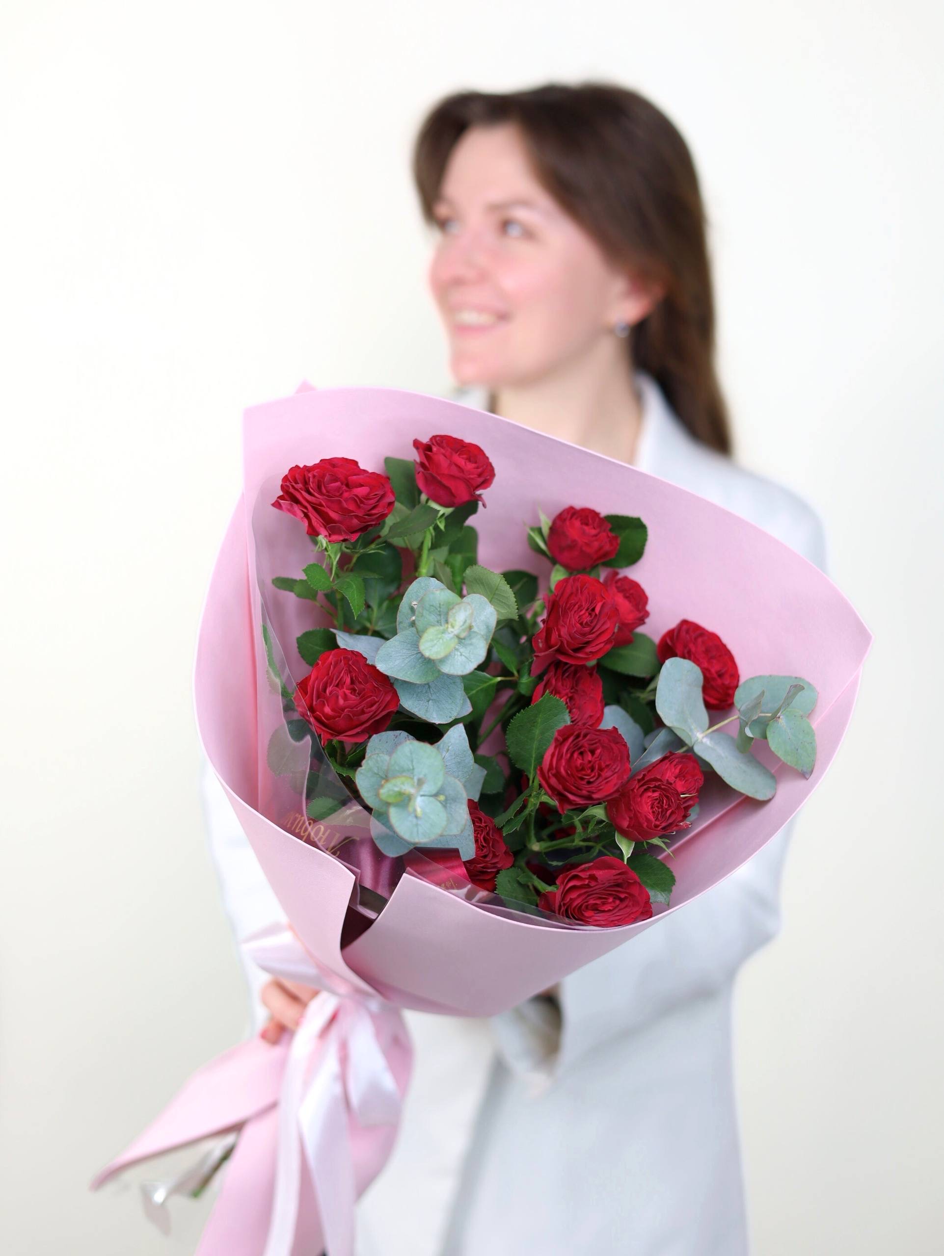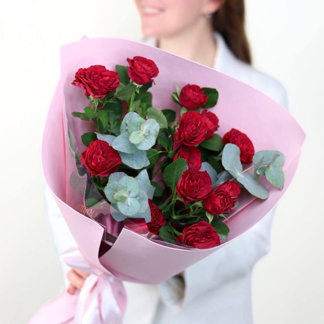 Прекрасный букет красных кустовых роз с душистым эвкалиптом в оформлении.
