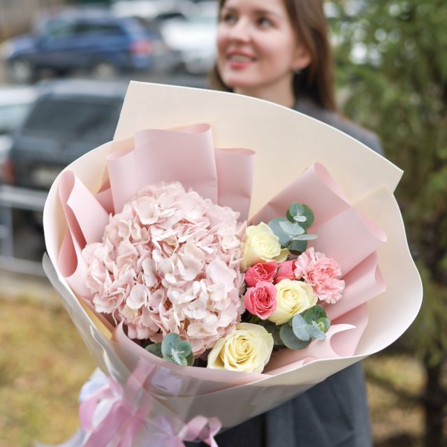 В букете: пышная гортензия, кустовые и одноголовые розы, диантус, эвкалипт.