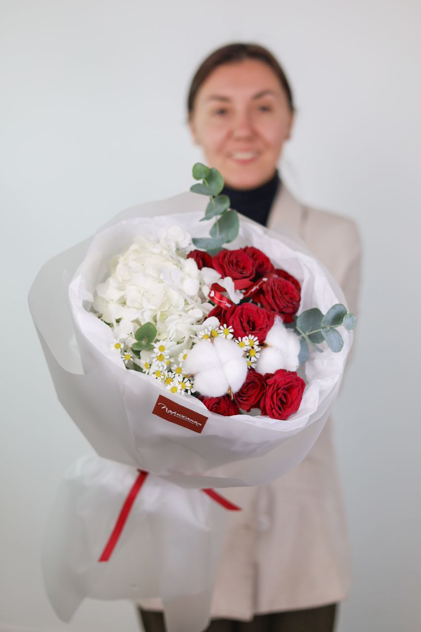 Букет с пышной гортензией, ароматной ромашкой, кустовой розой, хлопком и эвкалиптом в оформлении.