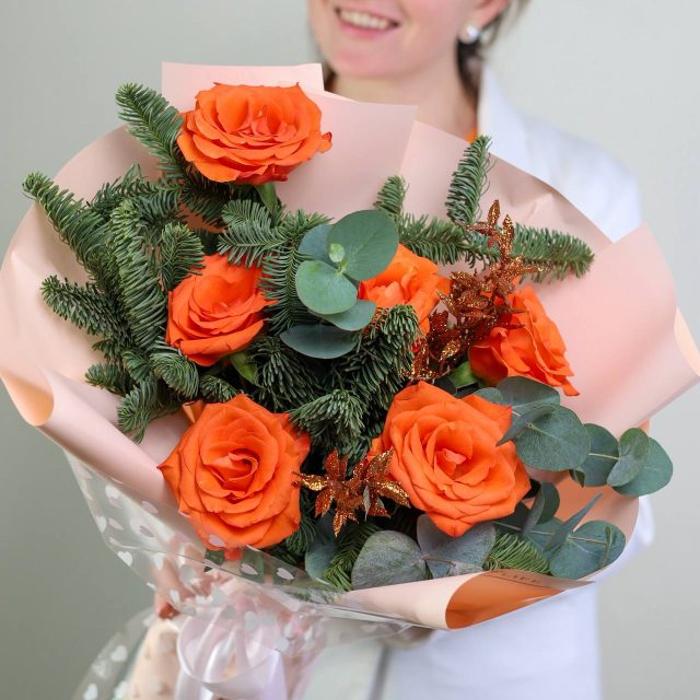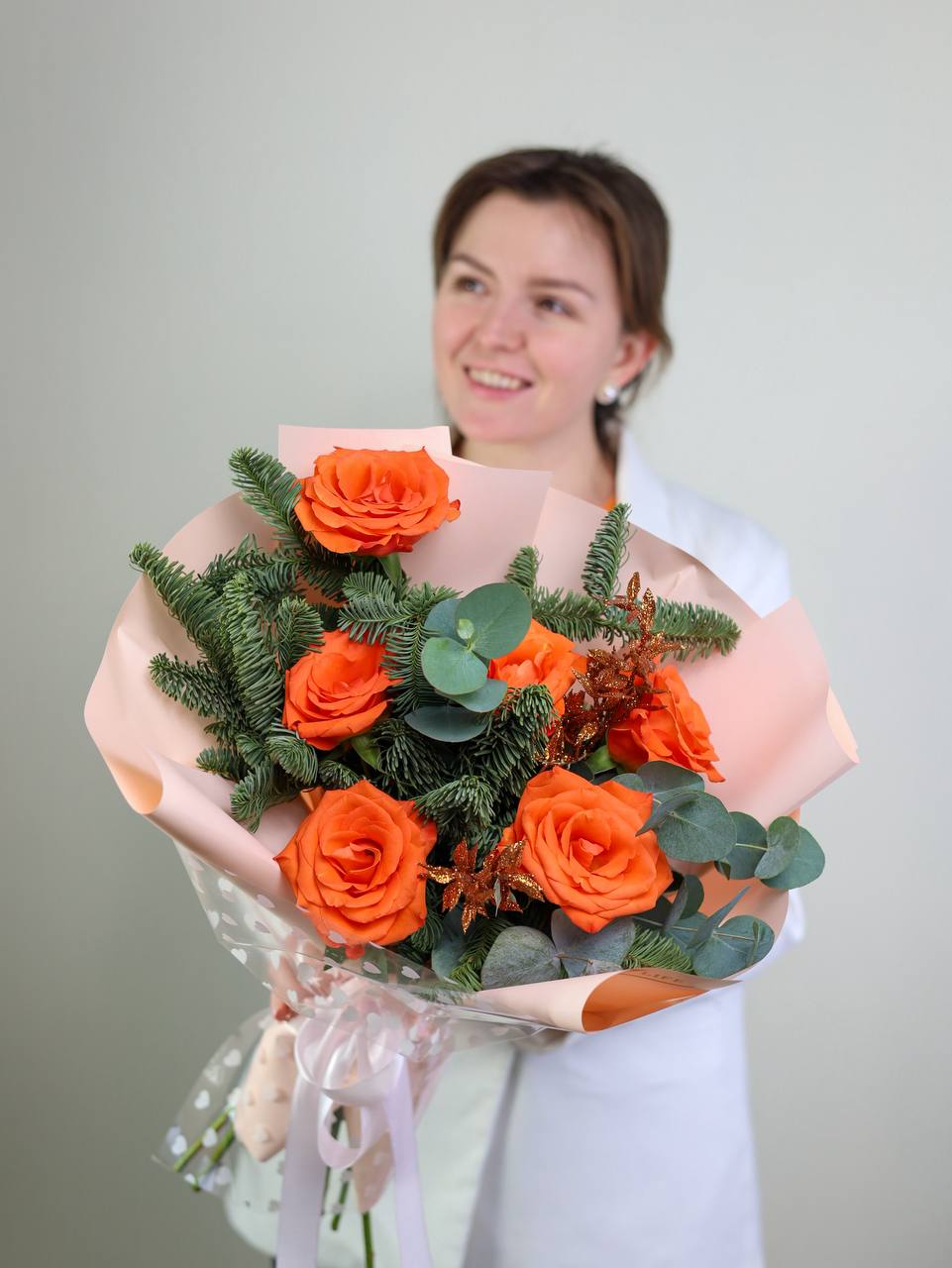 Букет роз, нобилиса и душистого эвкалипта в оформлении.