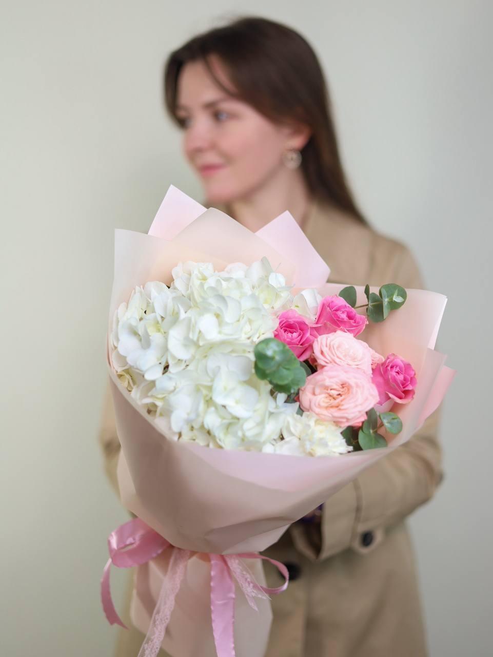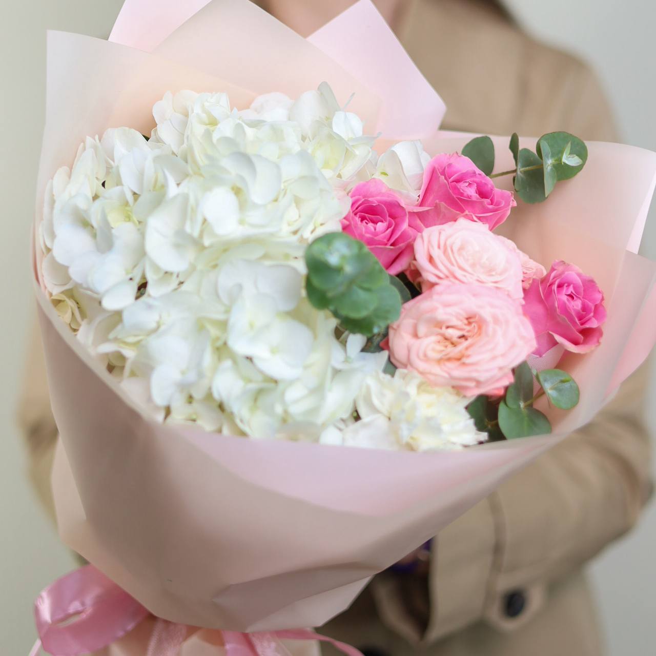 Букет пышной гортензии, кустовых роз, одноголовых роз и душистого эвкалипта в оформлении.