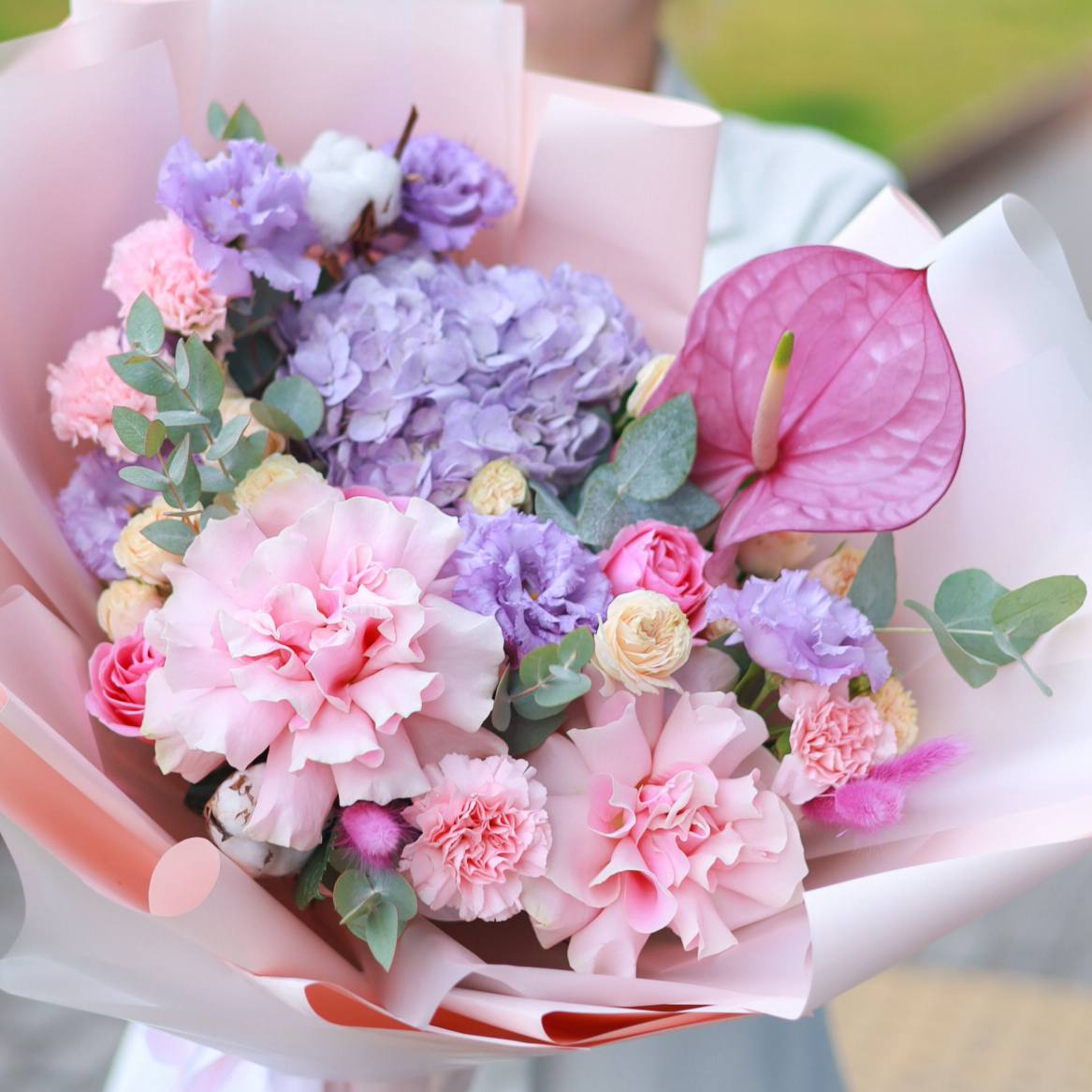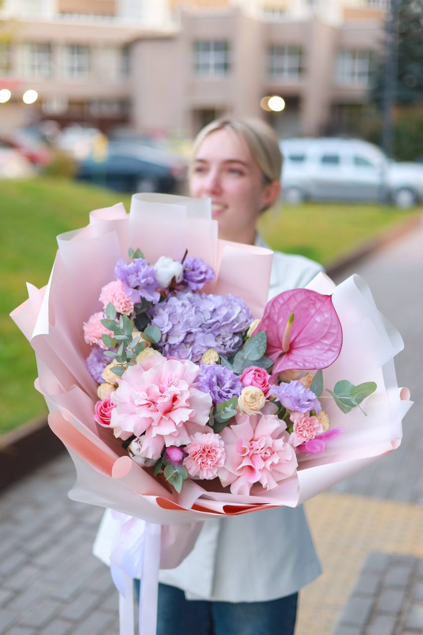 Букет пышной гортензии, французских роз, экзотического антуриума, ажурной эустомы, кустовых роз, зелени и сухоцветов в оформлении.