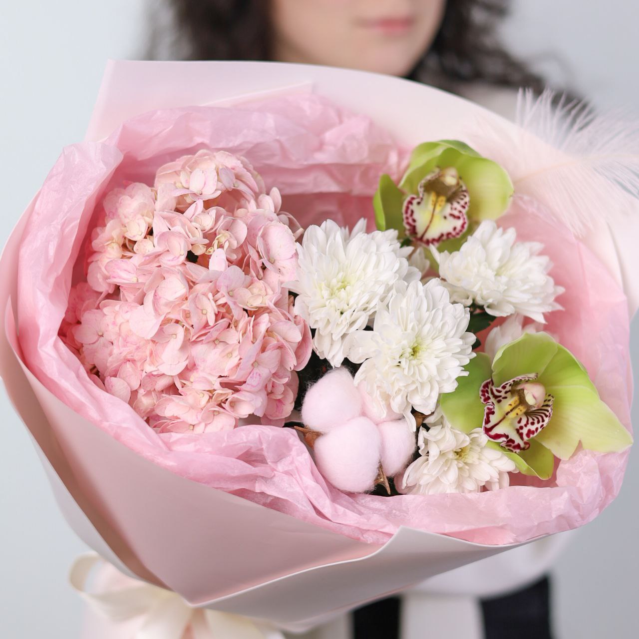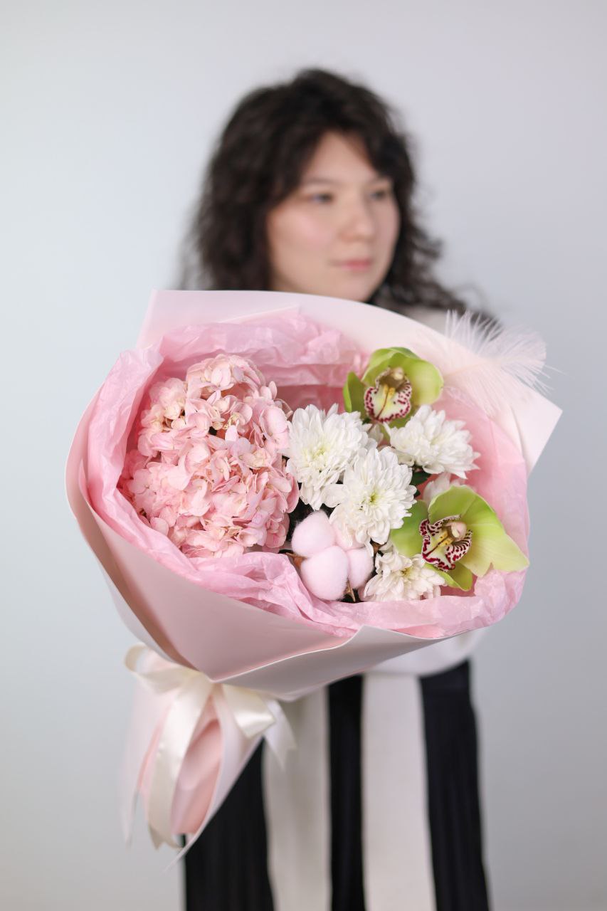 Букет с пышной гортензией, орхидеей, стойкой хризантемой и хлопком в оформлении.