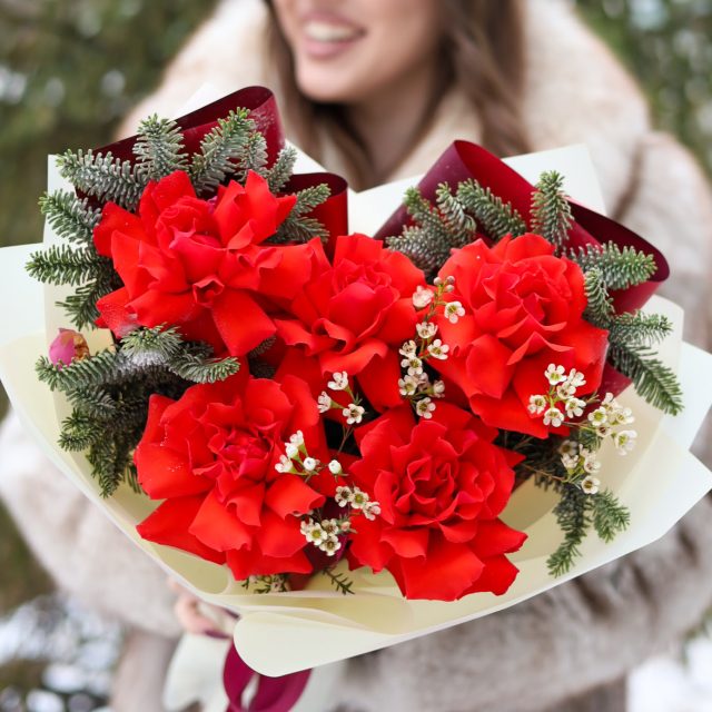 В букете: французские розы, хамелациум, нобилис.