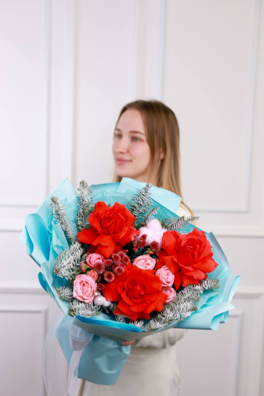 Букет кружевных роз, кустовых роз, хризантемы, хлопка и нобилиса в оформлении.