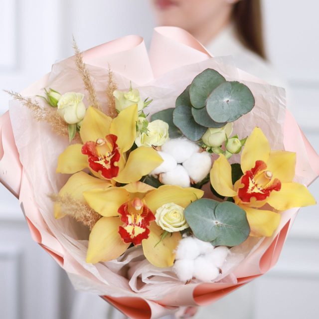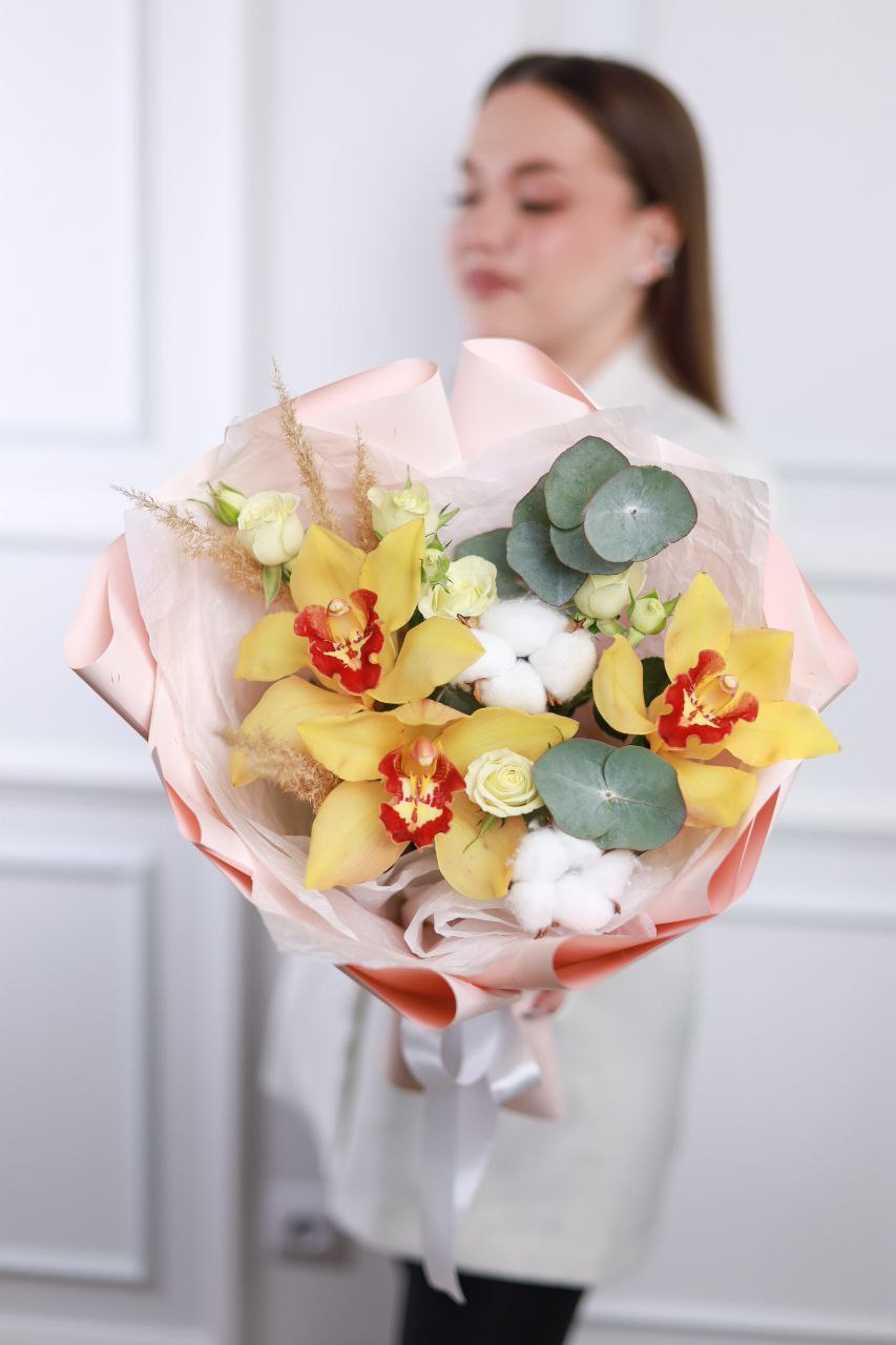 Букет с орхидеей, кустовой розой и эвкалиптом.