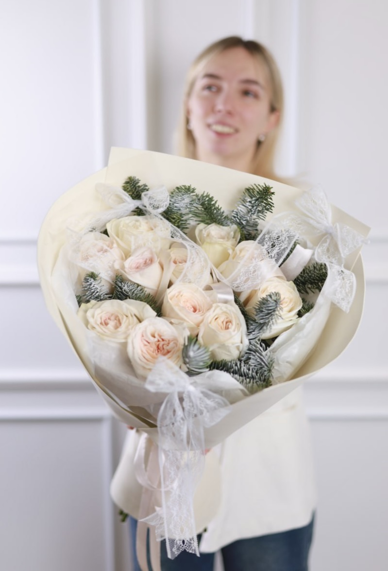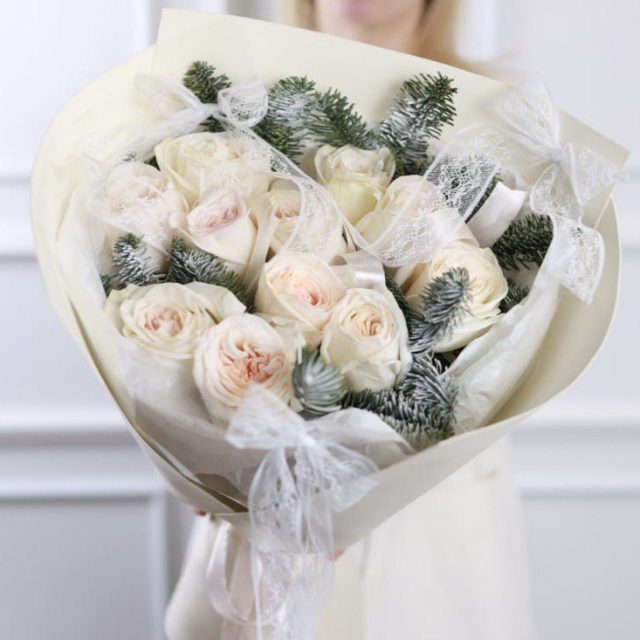 В составе букета 11 одноголовых, ароматных пионовидных роз White O’Hara с нобилисом