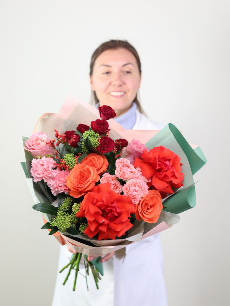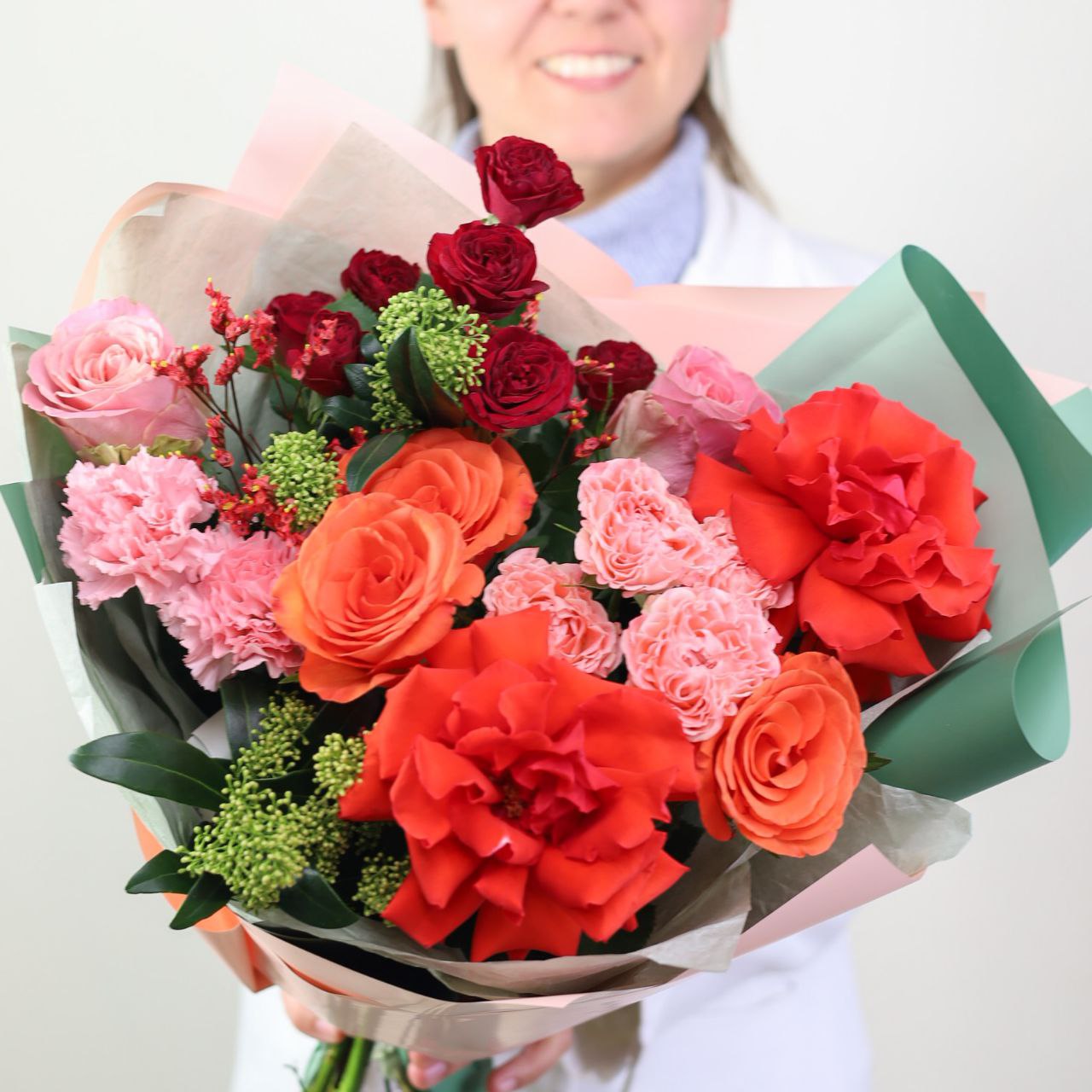 Букет с французской розой, стойким диантусом, лимониумом, крупной и кустовой розой в оформлении.