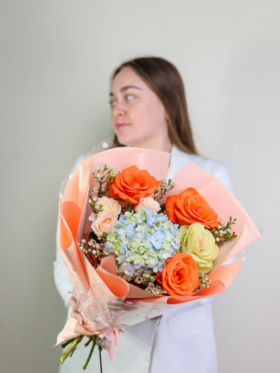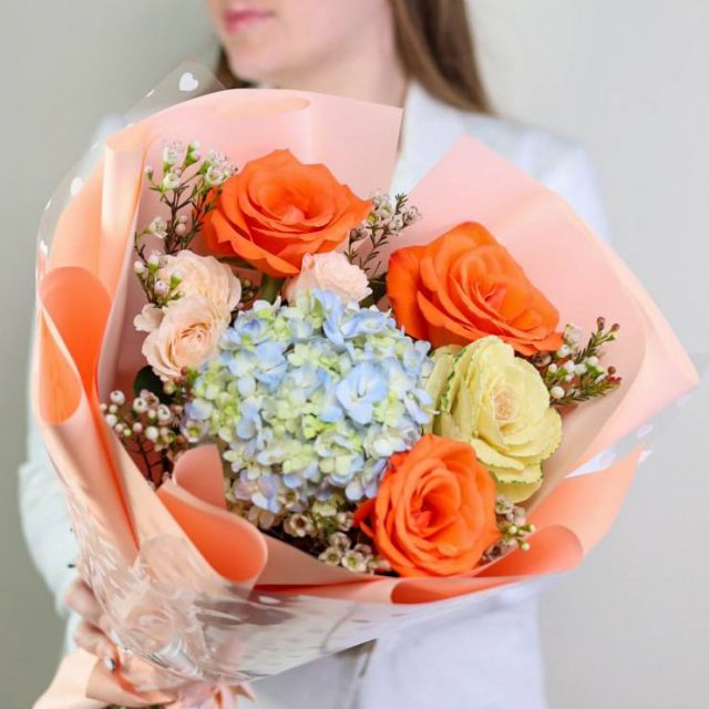 Букет пышной гортензии, брассики, роз и хамелациума в оформлении.