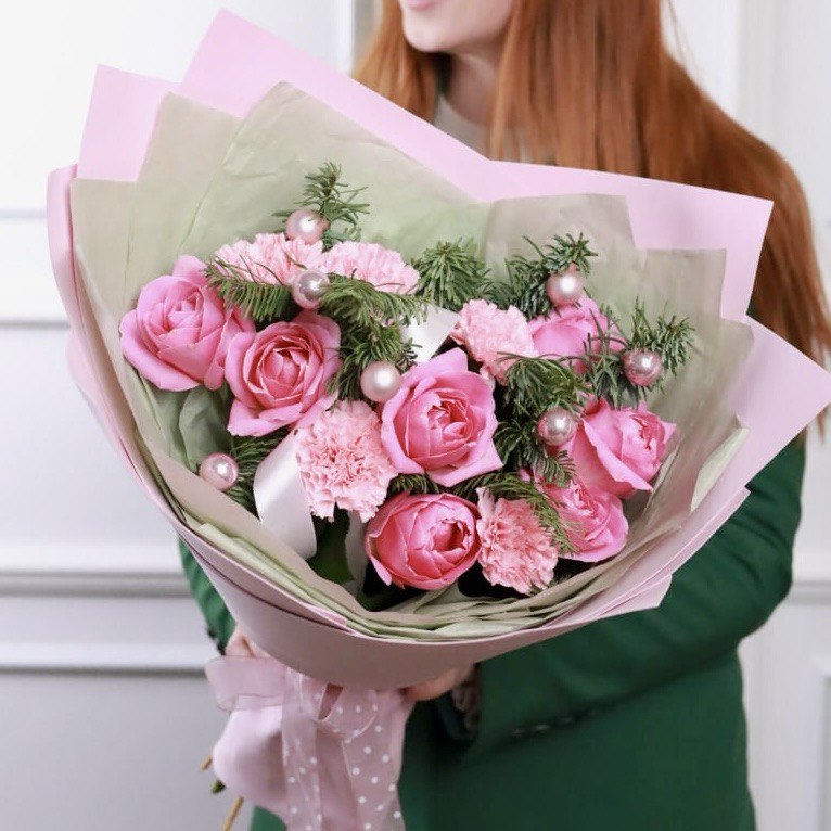 Букет роз, стойких динтусов, датской ели и новогодних шаров в оформлении.