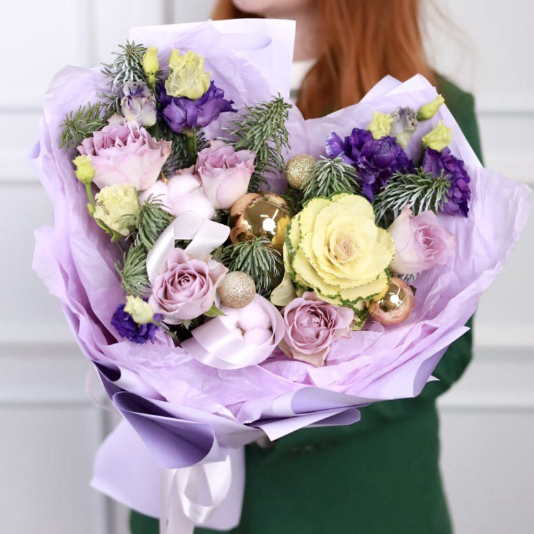 Состав: Эустома, одноголовые розы, брасика, хлопок, нобилис и новогодние шары