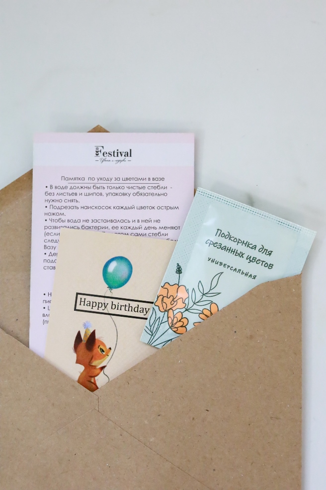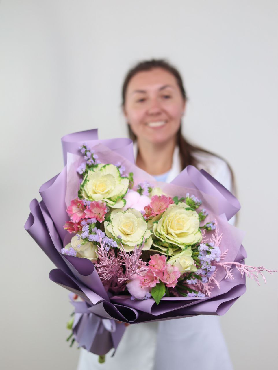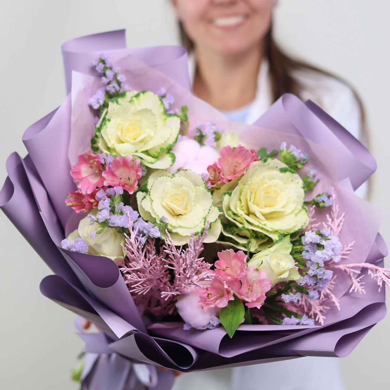 Стойкий букет с брассикой, альстромерией, розой, статицей, хлопком и декором в оформлении.