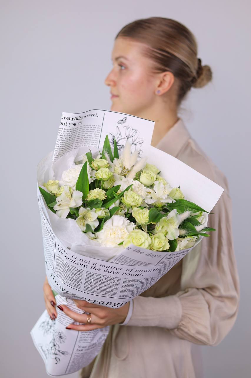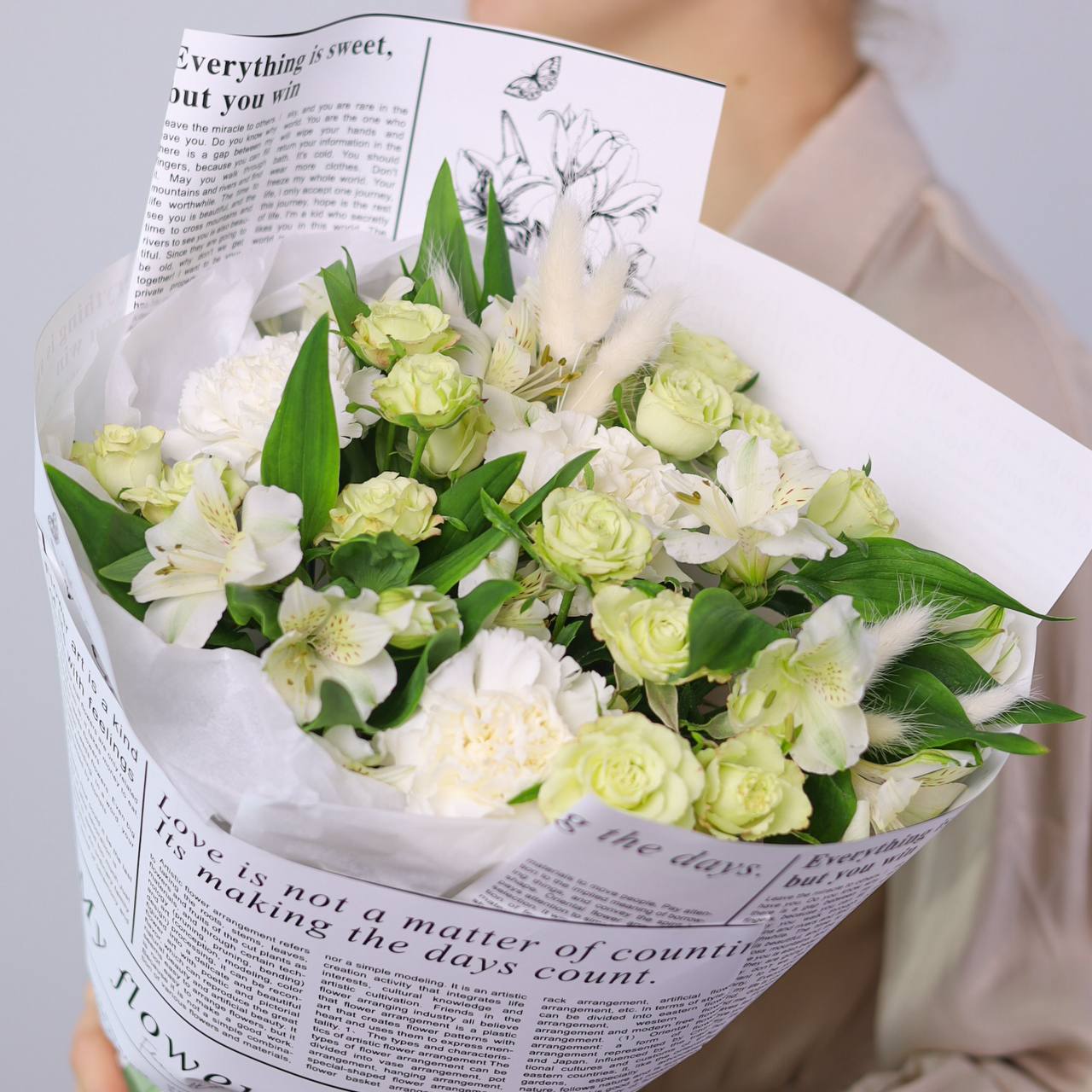 Букет кустовых роз, стойкой альстромерии, диантусов и сухоцветов в оформлении.