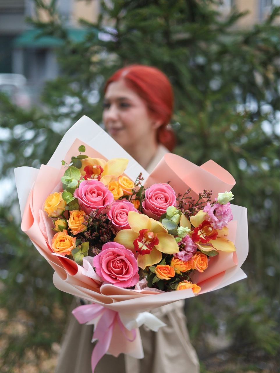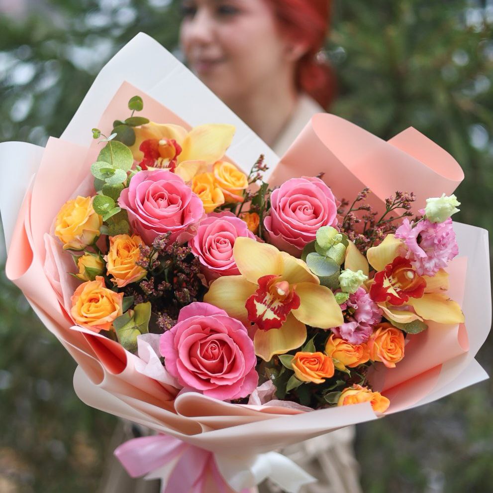 Букет с пионовидной кустовой розой, орхидеей, розой, ажурной эустомой, лимониумом и эвкалиптом в оформлении.