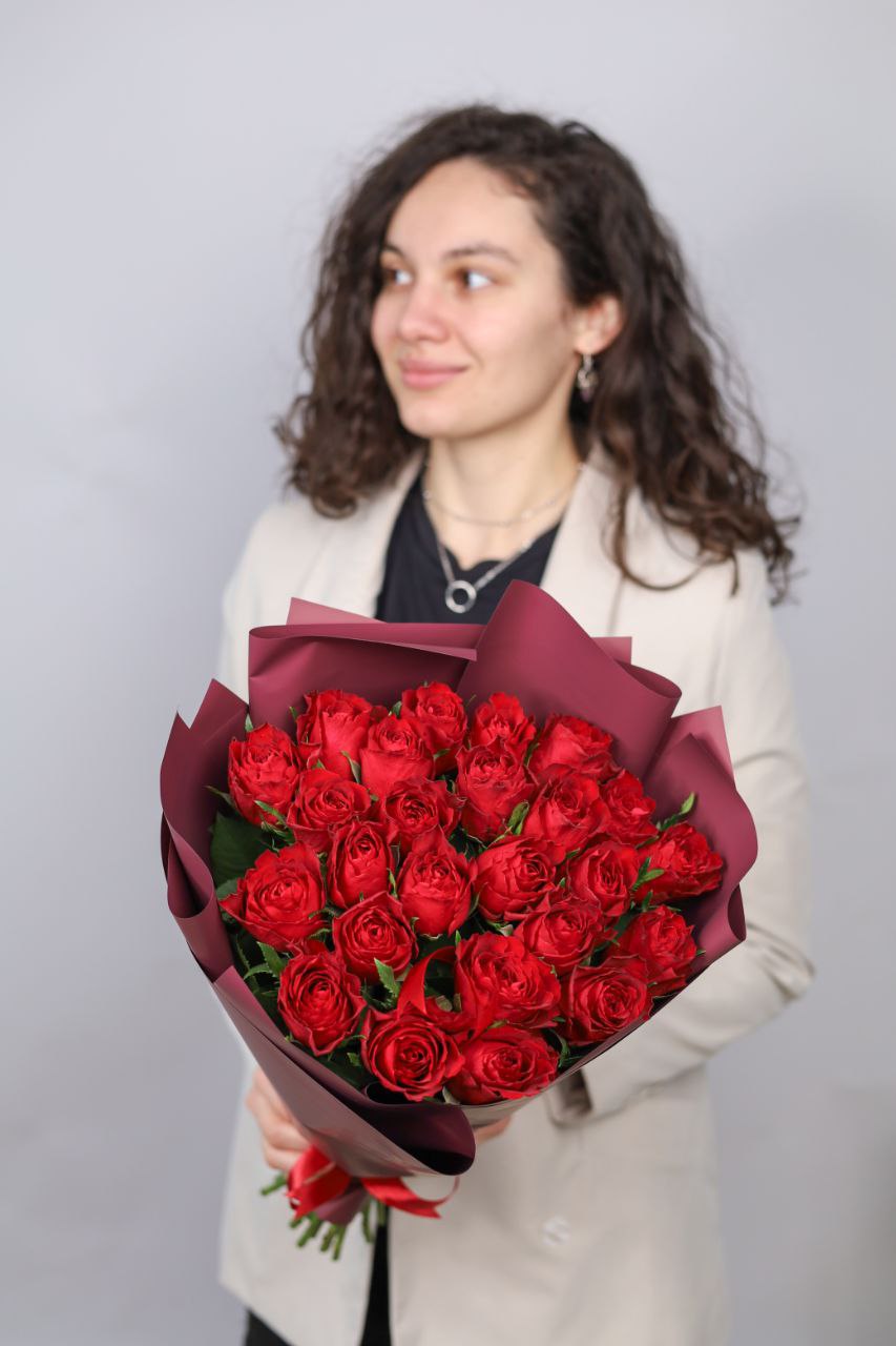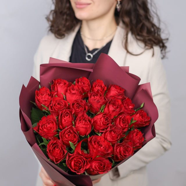 Букет из 25-ти прекрасных красных роз в оформлении. Высота букета около 45см.