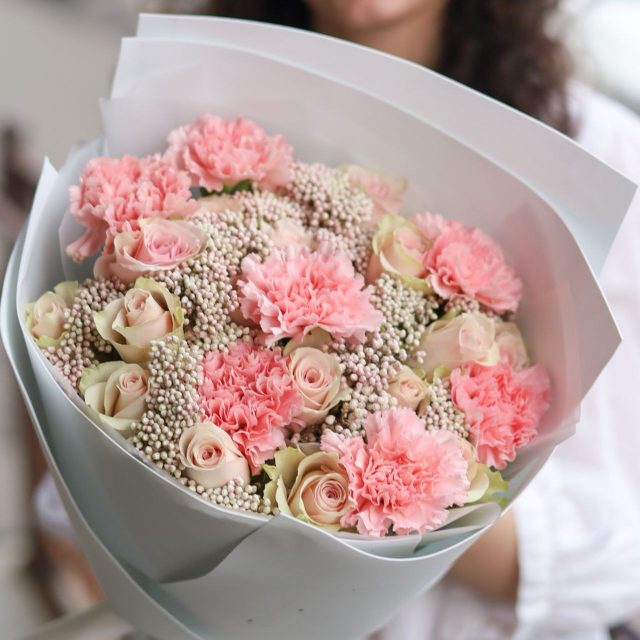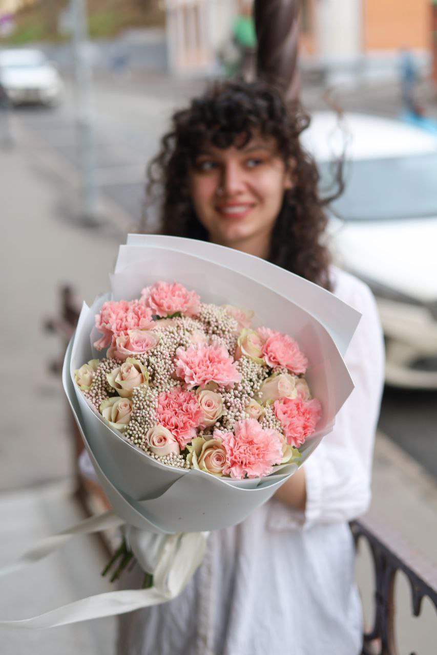 Букет нежных роз, диантусов и озотамнуса в оформлении.