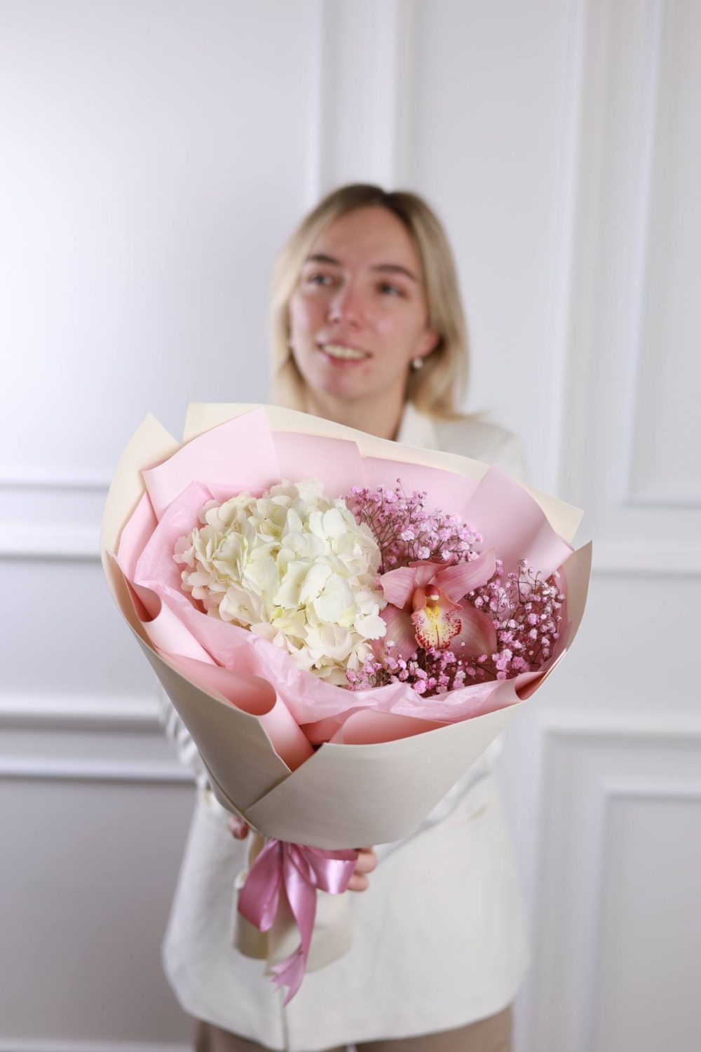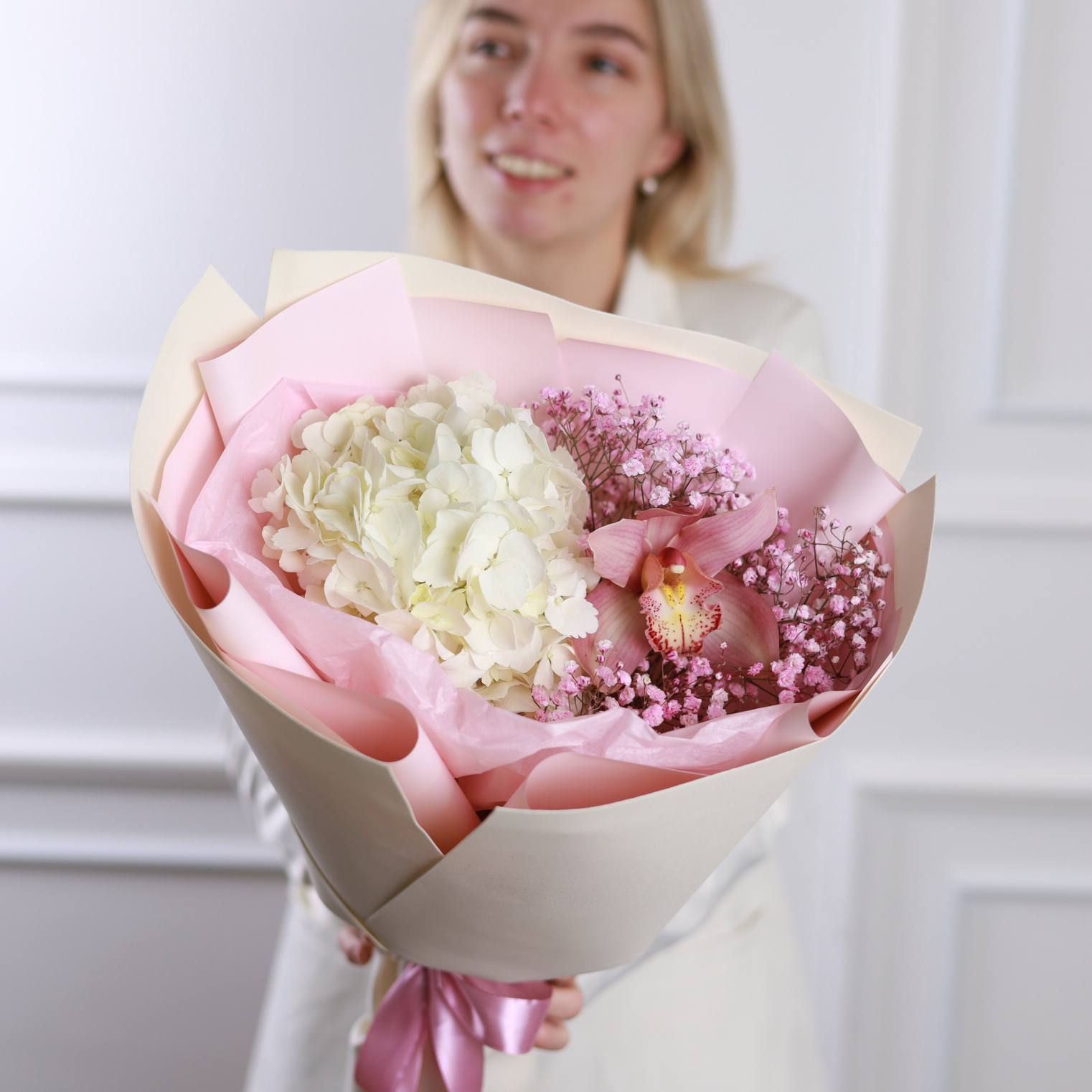 Состав: пышная гортензия, стойкая орхидея и гипсофила.