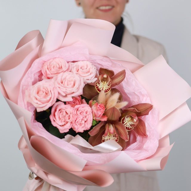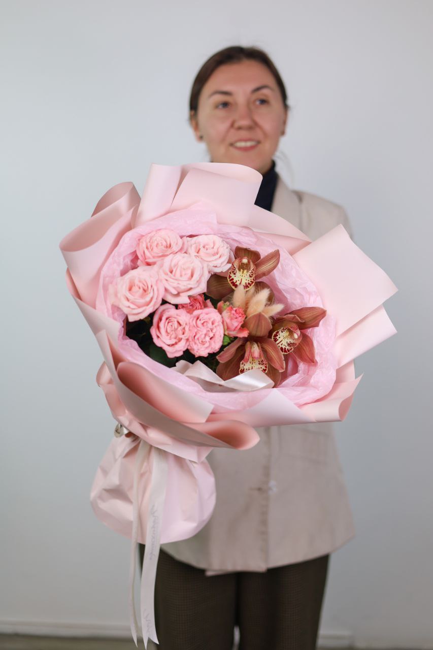 Букет с пионовидной кустовой розой и орхидеей в оформлении.