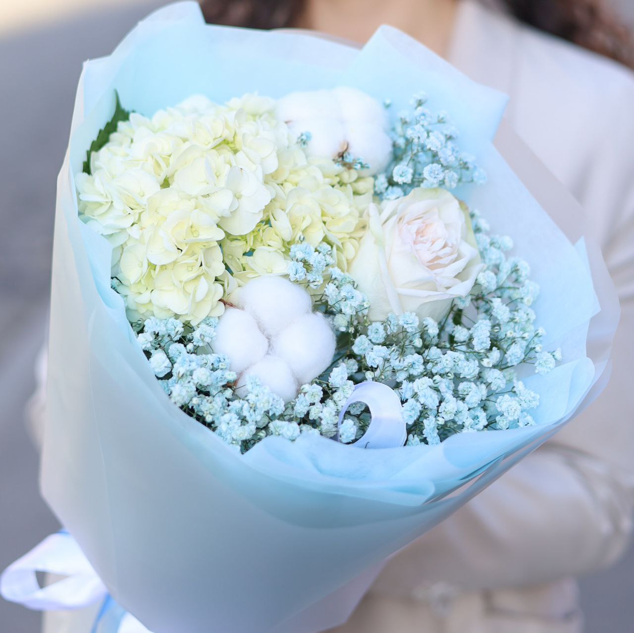 Букет с пышной гортензией, пионовидной розой и стойкой гипсофилой в оформлении.