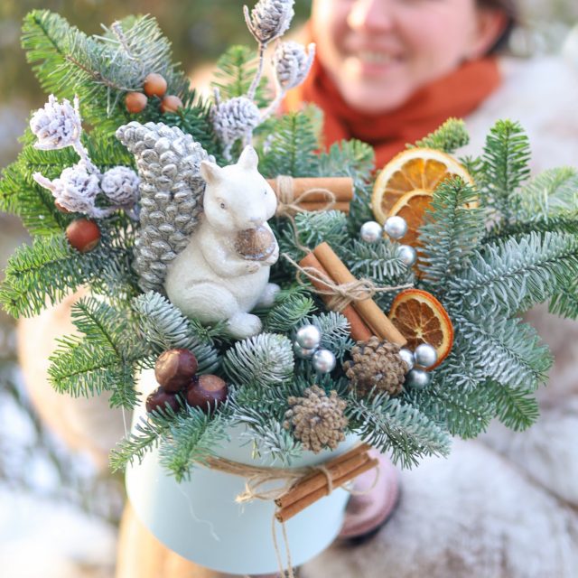 Состав: шишки и орешки, палочки корицы, елочные игрушки, апельсины, ель нобилис, фигурка белочки. Высота около 30-35 см.