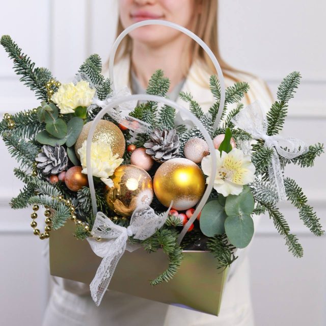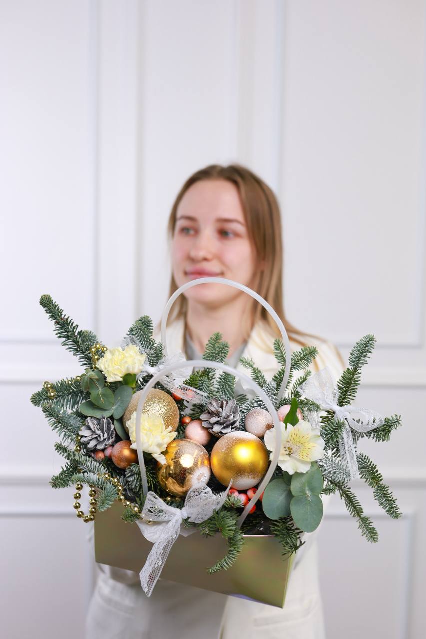 Композиция нобилиса, декоративных игрушек, шишек, альстромерий, диантусов и ягод в сумочке.