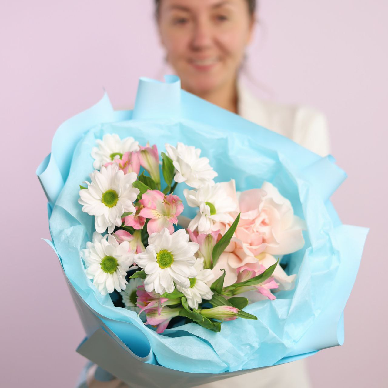 Букет со стойкой альстромерией, пышной хризантемой и французской розой в оформлении.