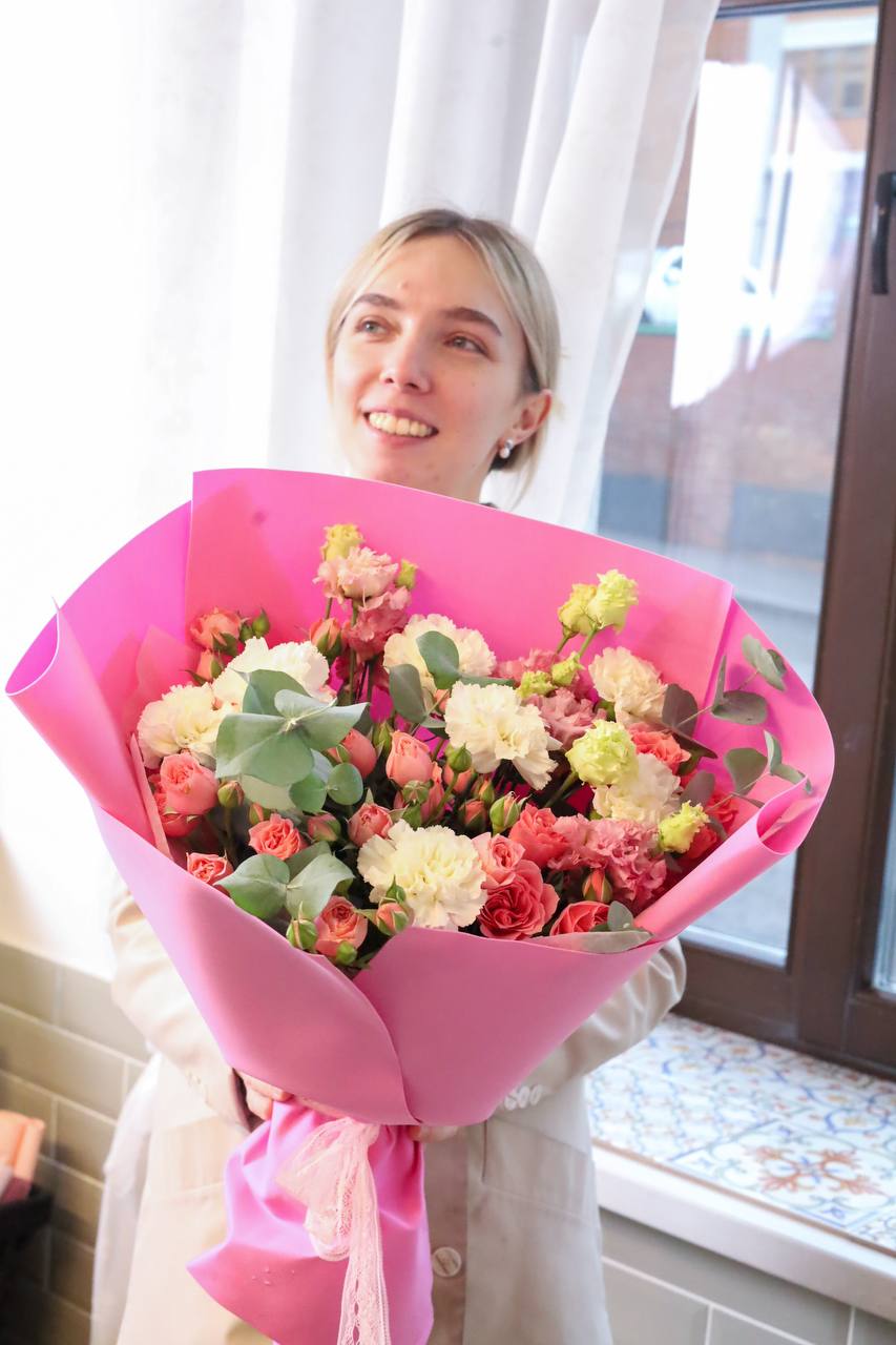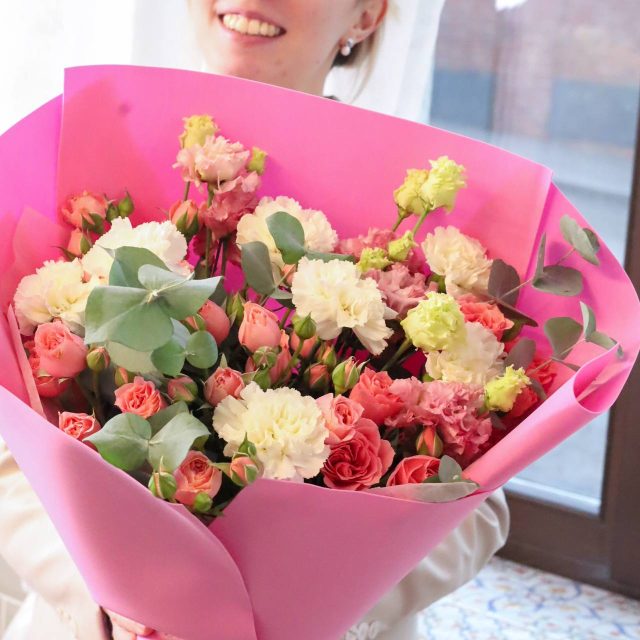Букет ажурной эустомы, кустовых роз, стойких диантусов и душистого эвкалипта в оформлении.
