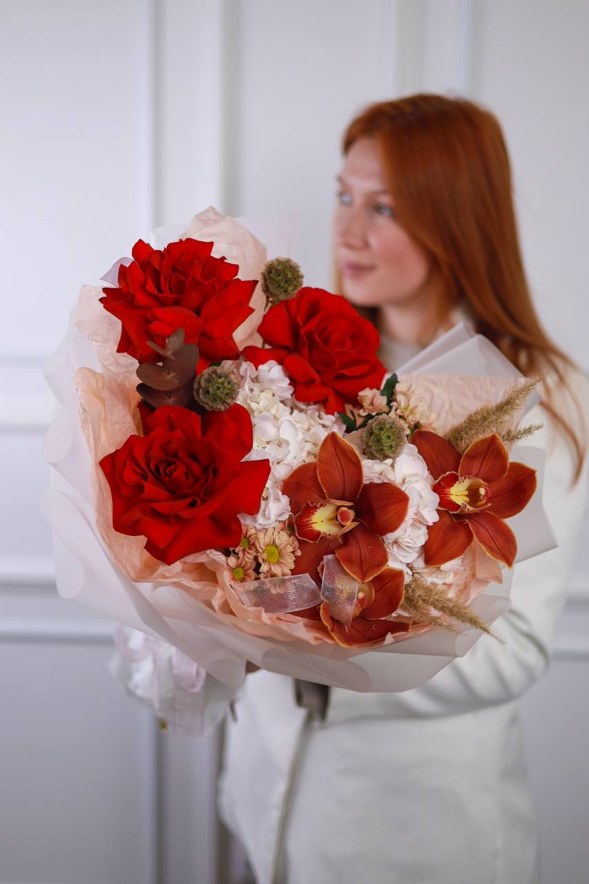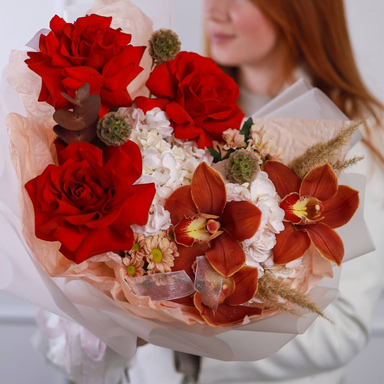 Букет пышной гортензии, французских роз, стойких орхидей, хризантемы и сухоцветов в оформлении.