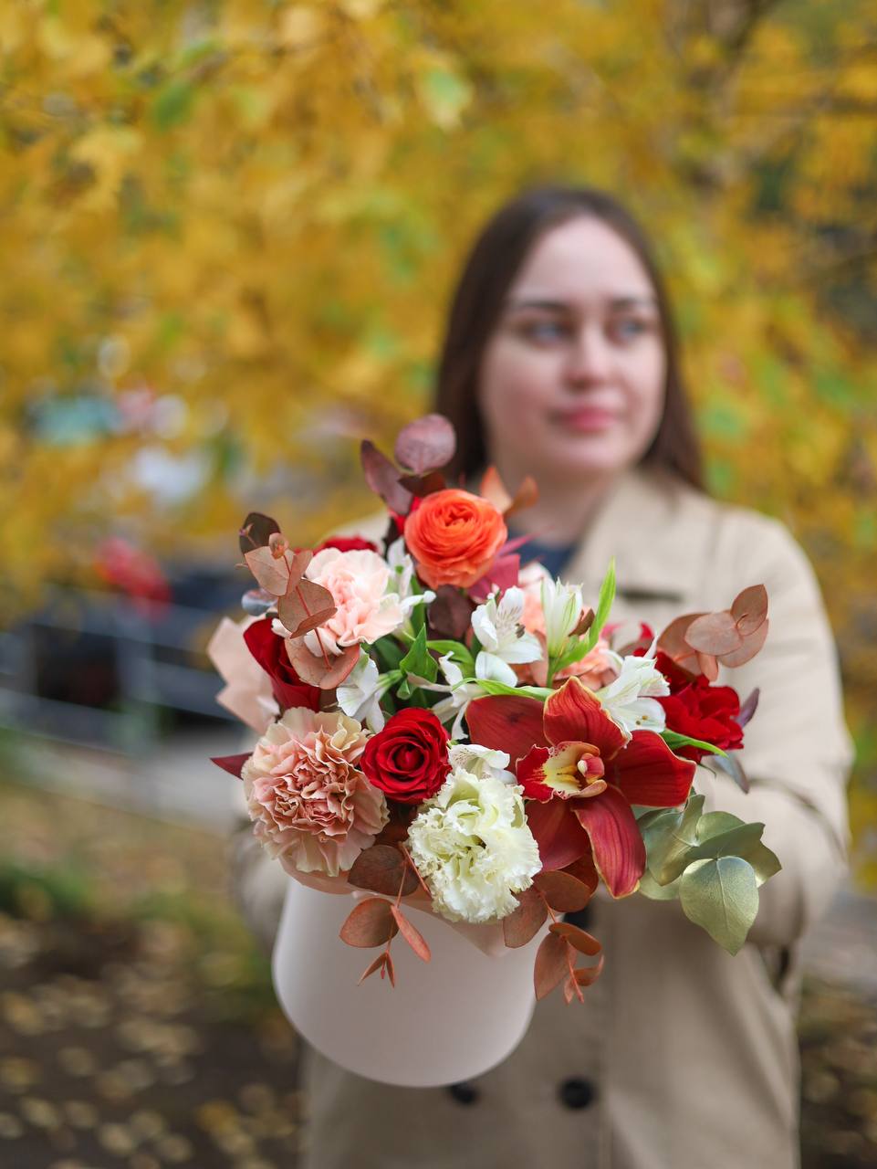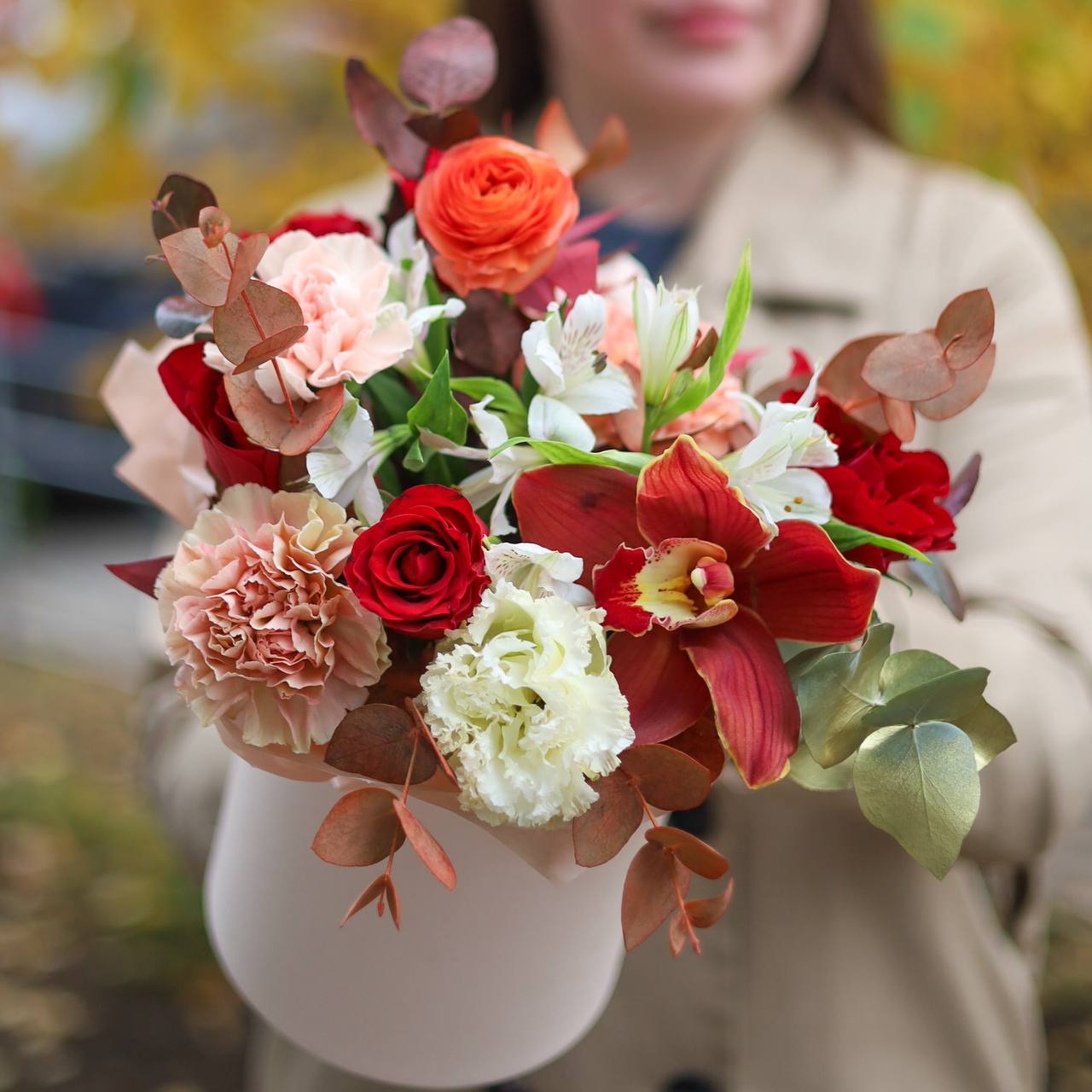 Композиция орхидеи, ажурной эустомы, роз, стойких диантусов, ранункулуса, альстромерий и душистого эвкалипта в шляпной коробке.
