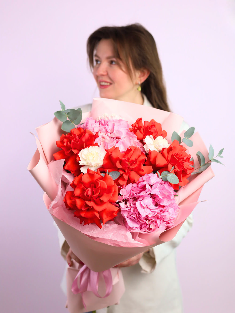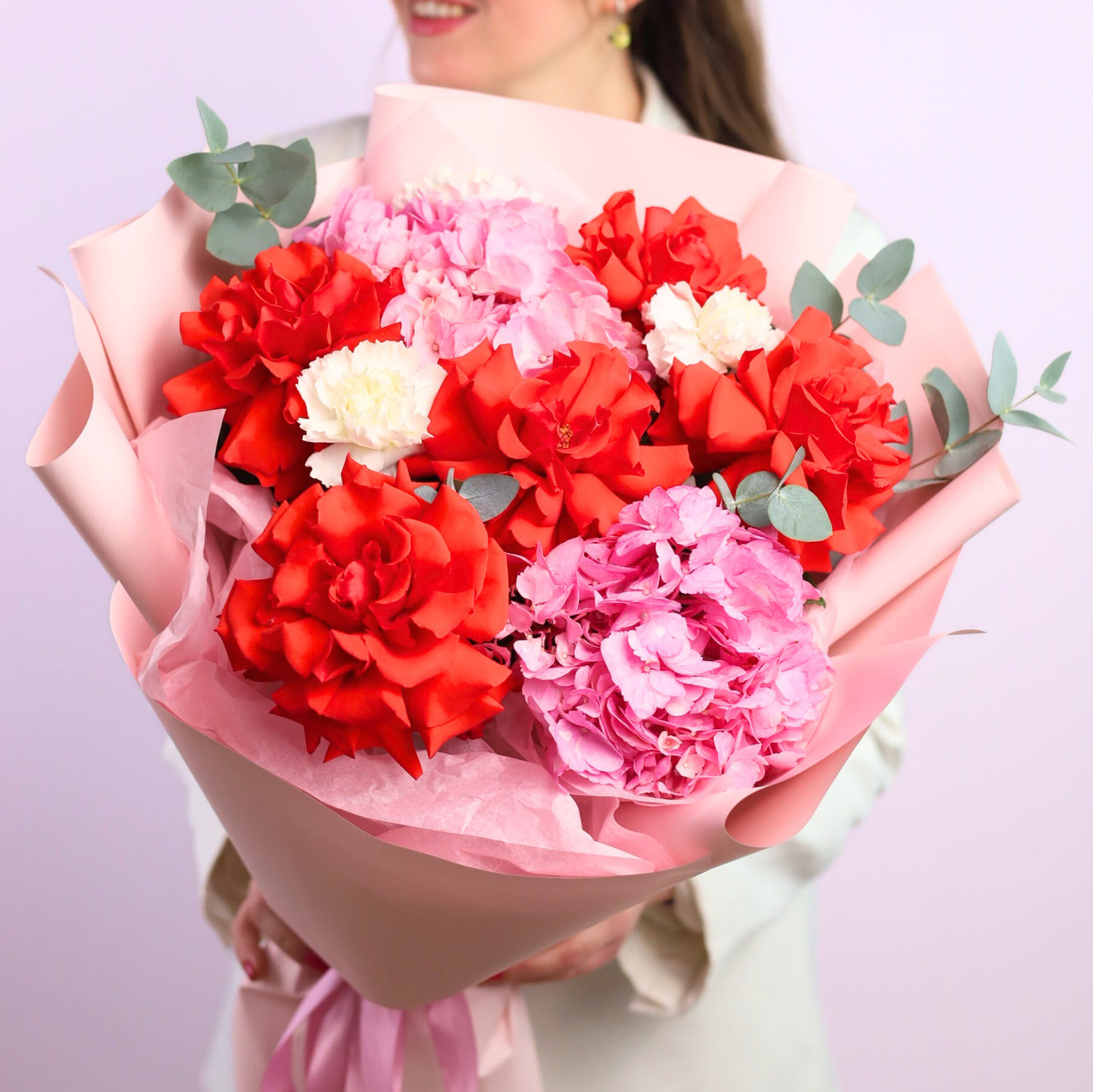 Состав: пышные гортензии, французские розы, стойкие диантусы, эвкалипт.