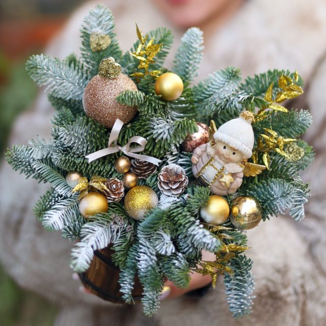 Состав: новогодний декор, натуральный нобилис, шишки, фигурка ангела. Высота около 25 см.