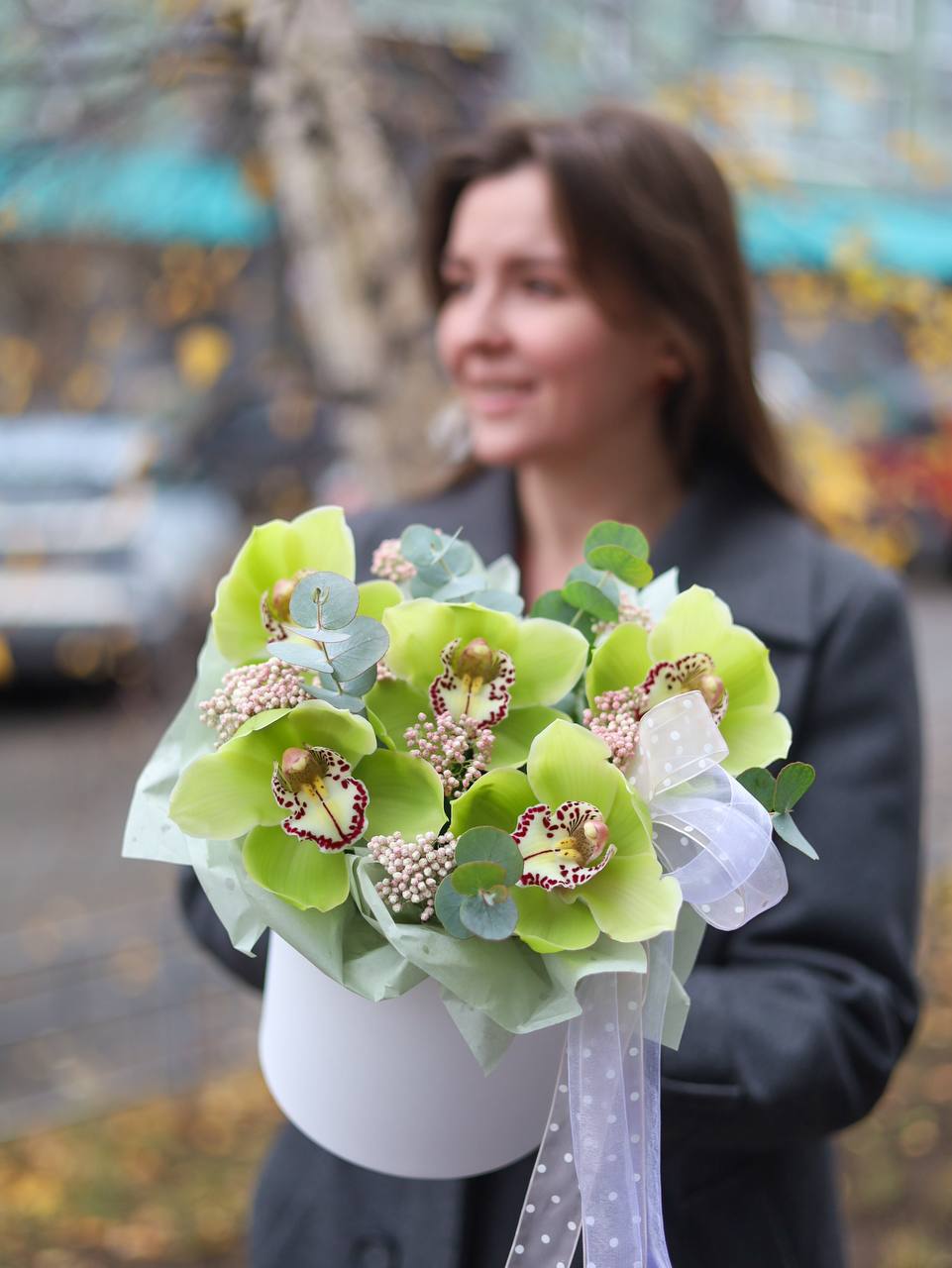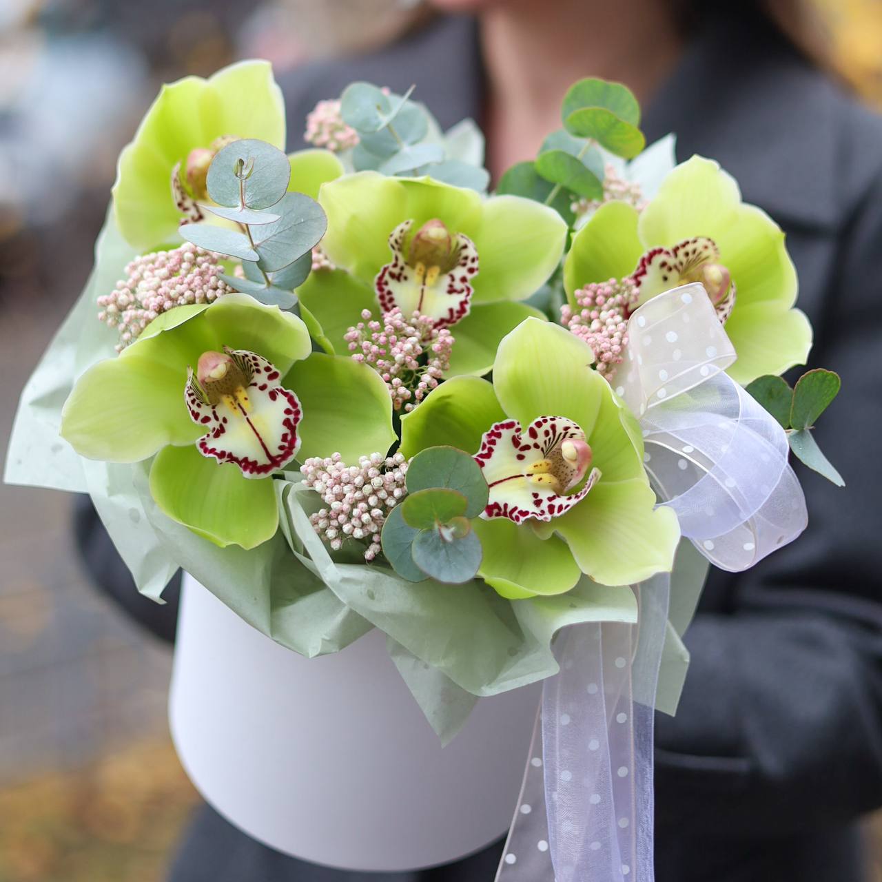 Композиция стойких орхидей, душистого эвкалипта и озотамнуса в шляпной коробке.