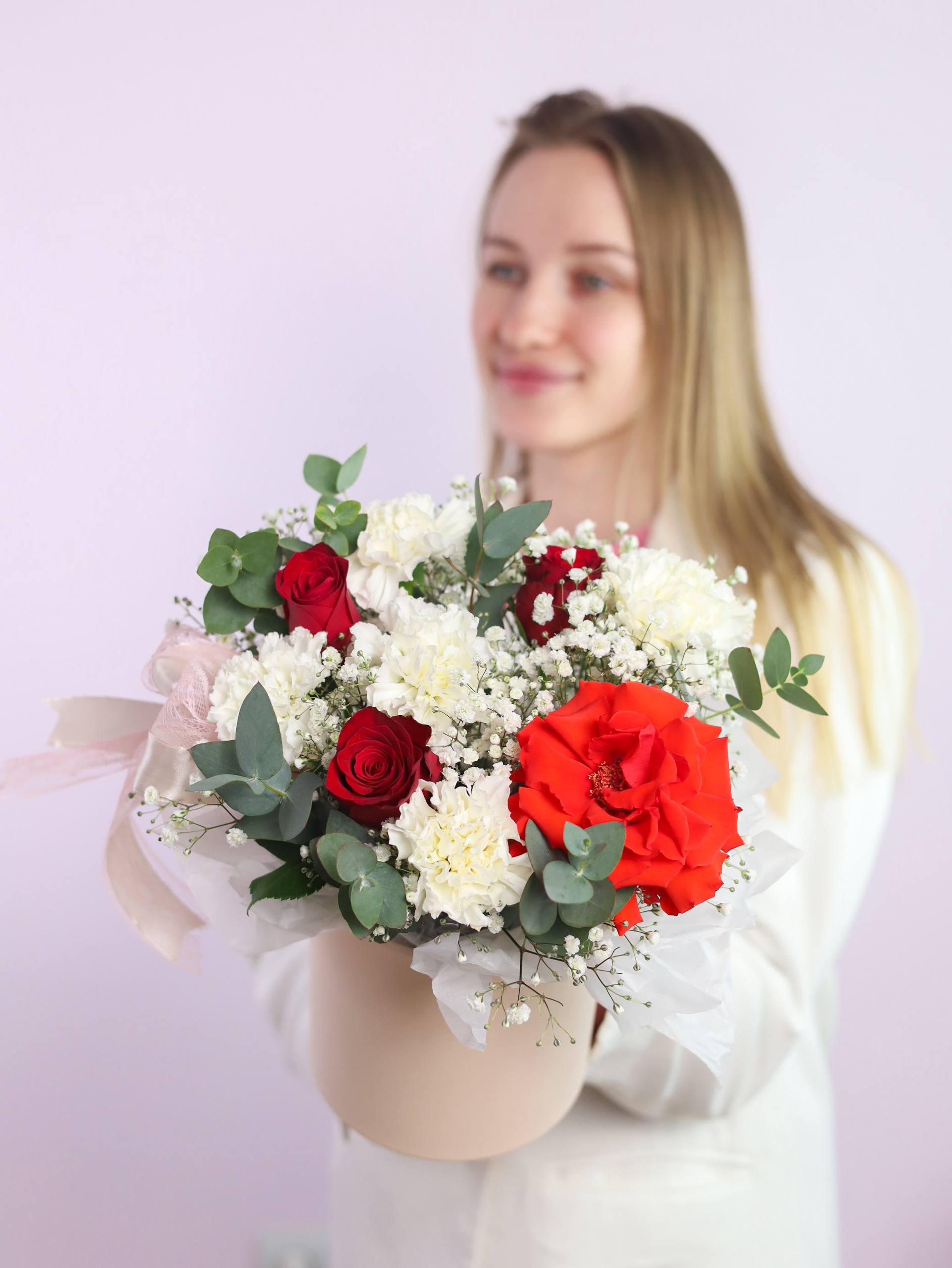 Композиция французской розы, стойких диантусов, роз, воздушной гипсофилы и душистого эвкалипта в шляпной коробке.