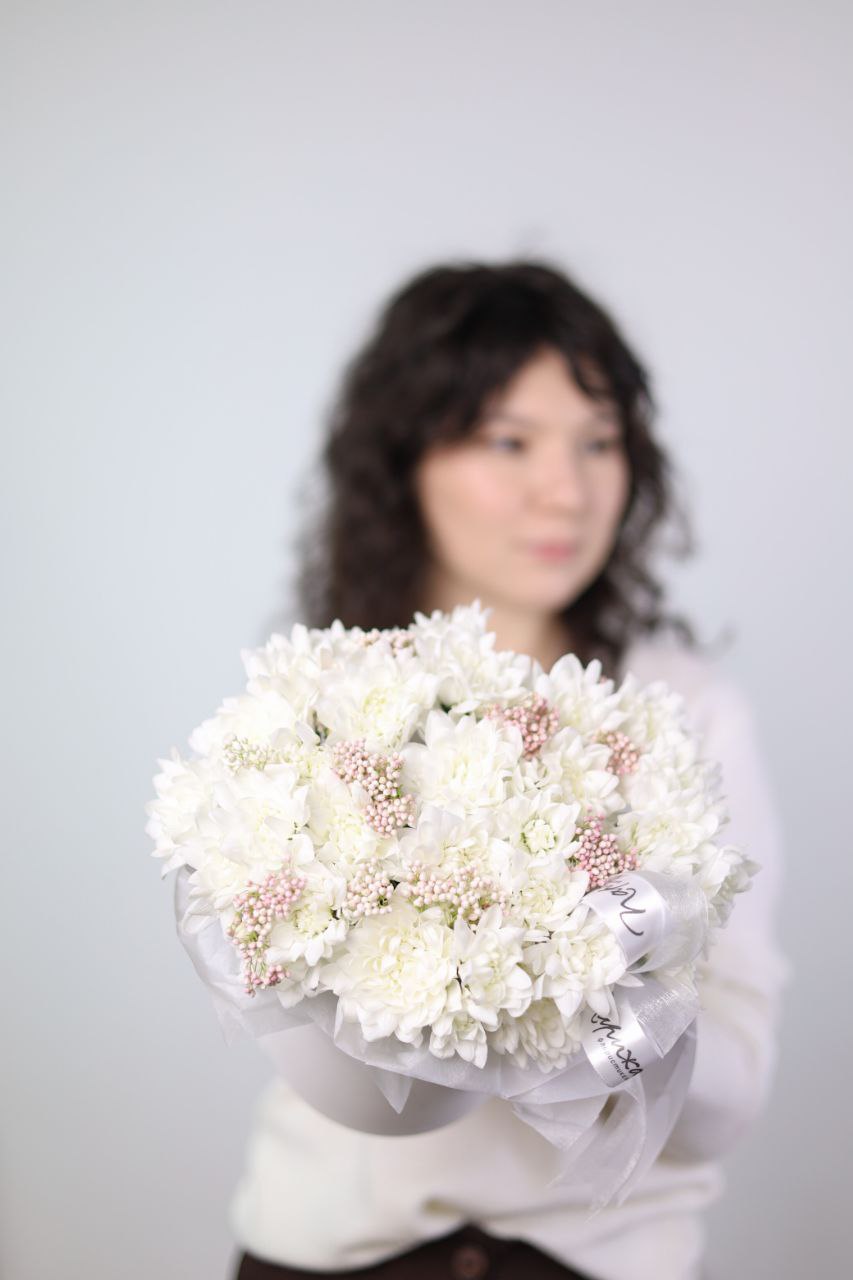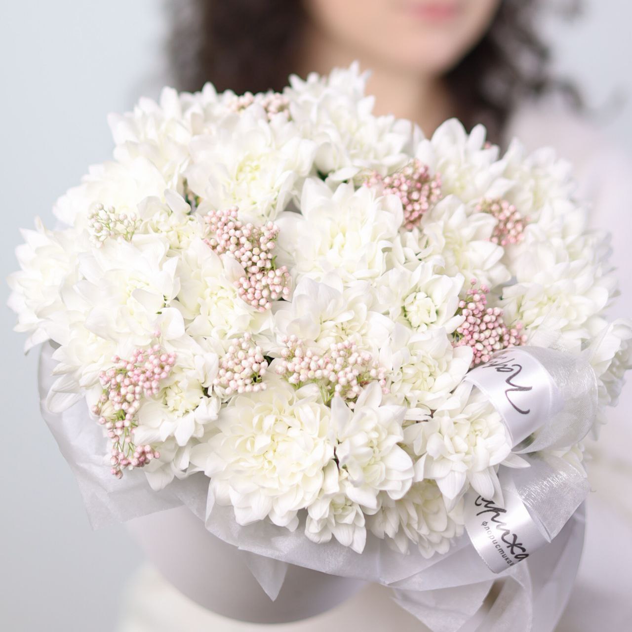 Композиция в шляпной коробке с пышной хризантемой и озотамнусом.