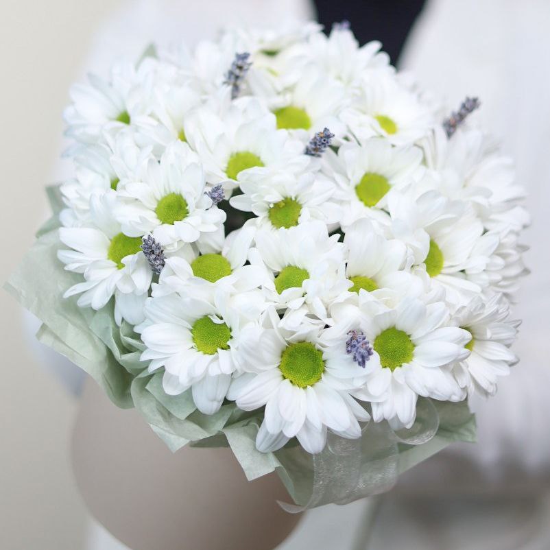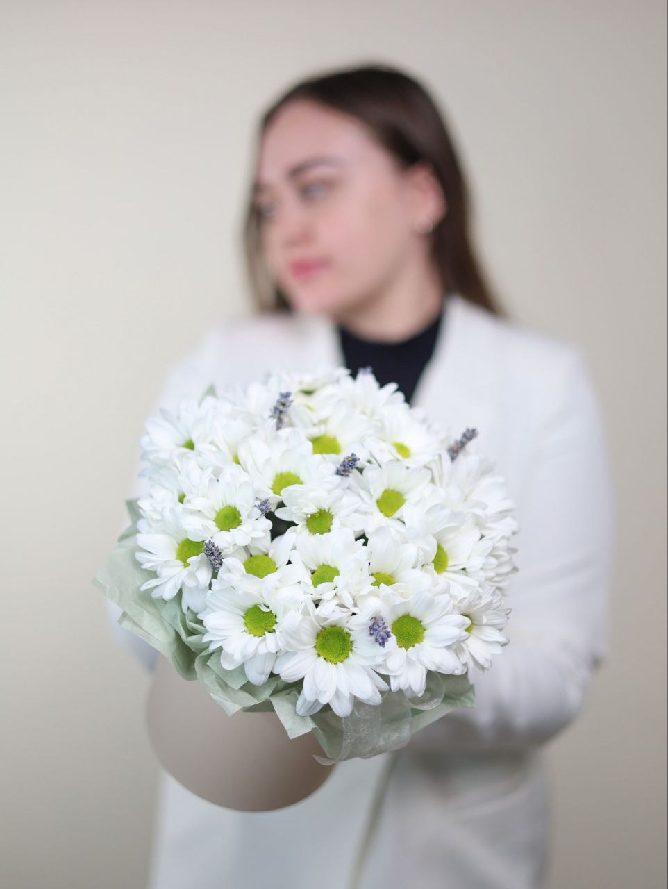 Композиция в шляпной коробке с пышной хризантемой и лавандой.