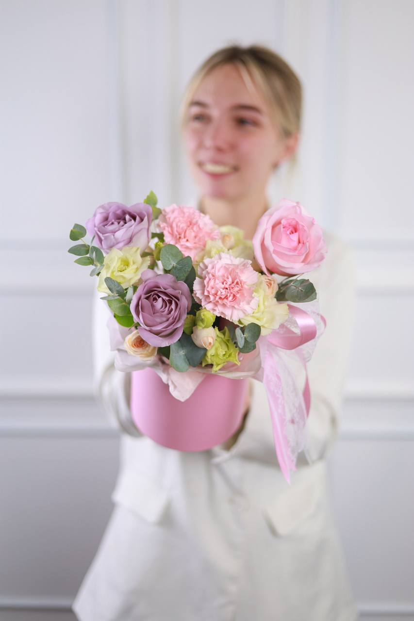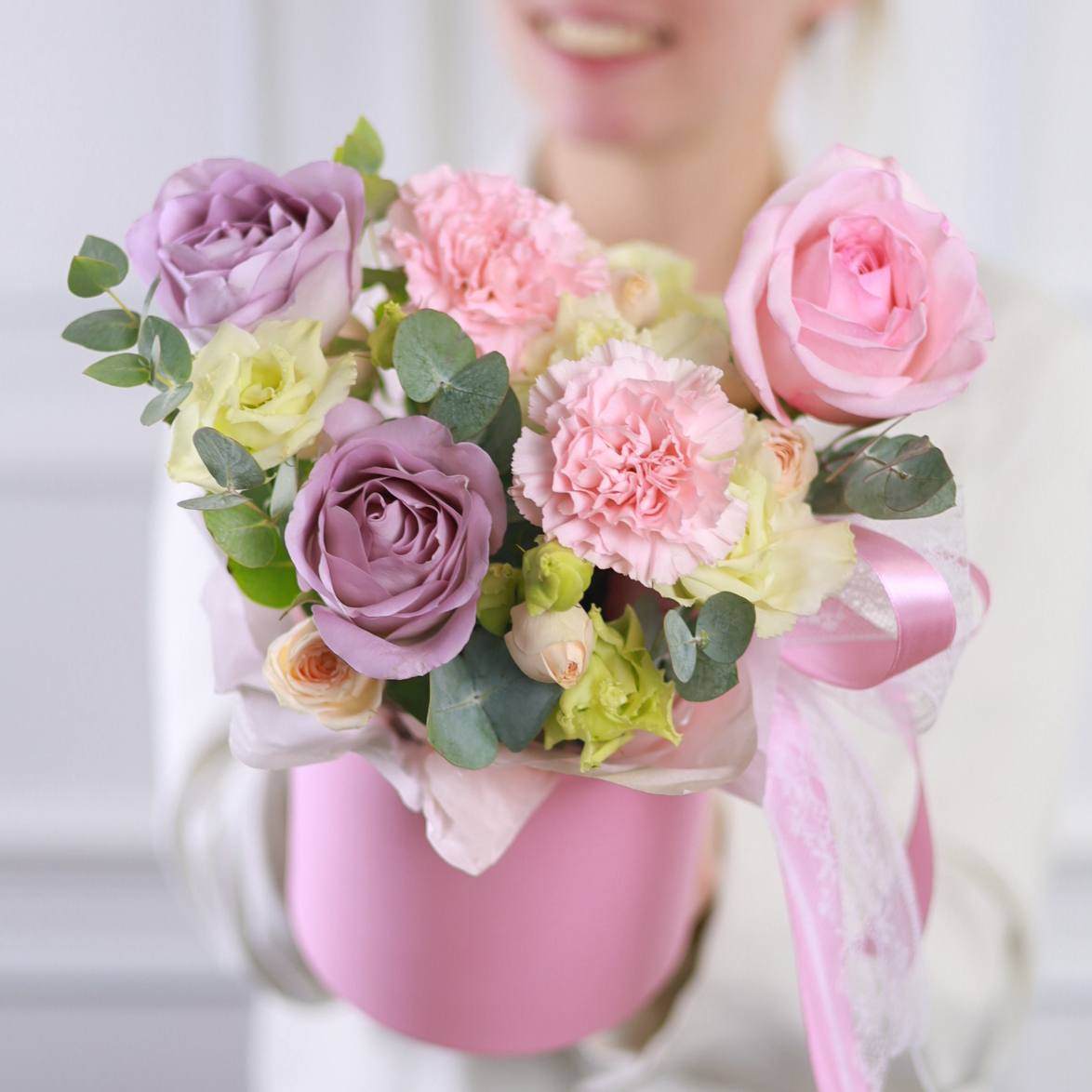 Композиция роз, ажурной эустомы, стойких диантусов, кустовых роз и душистого эвкалипта в шляпной коробке.