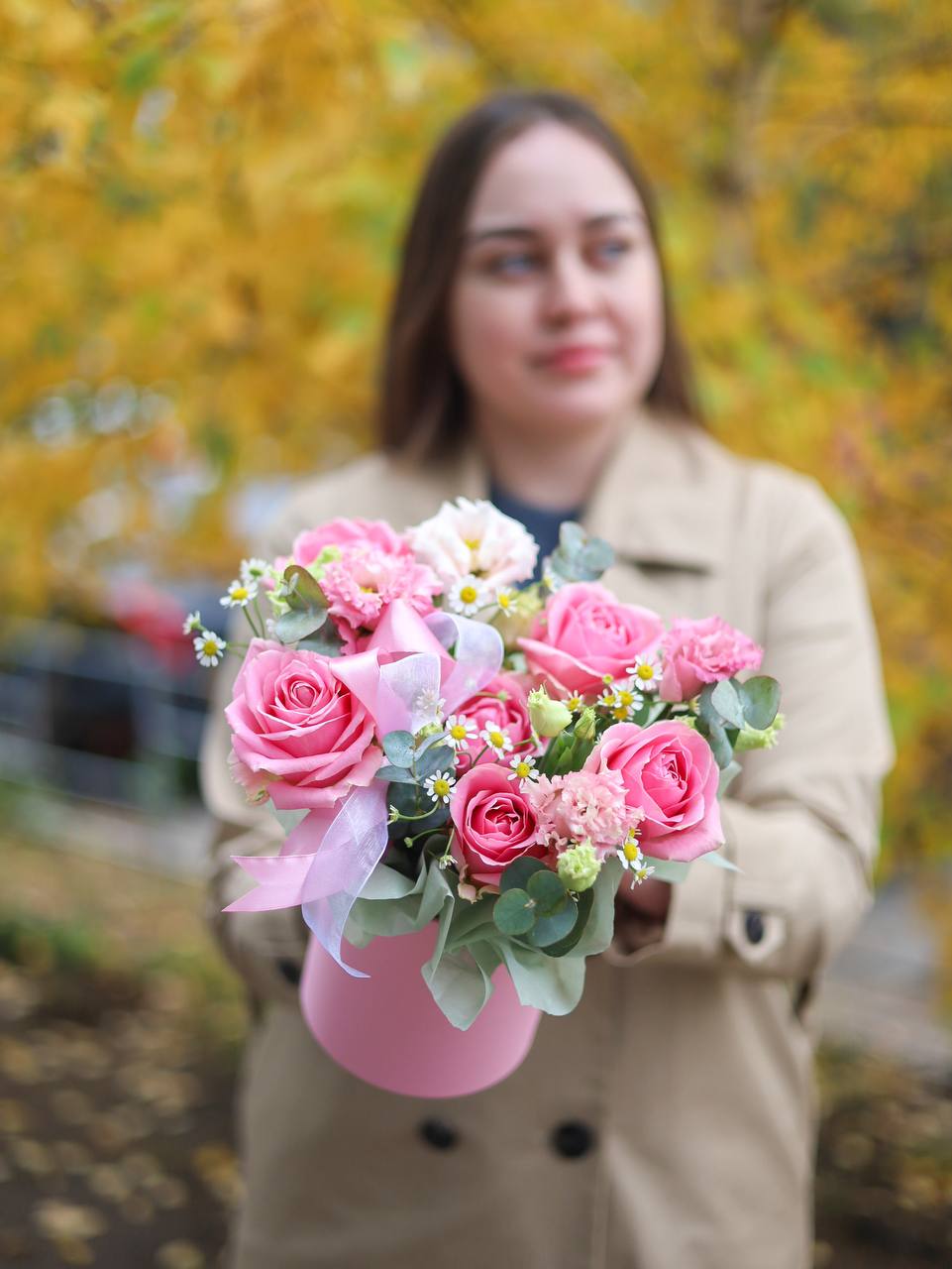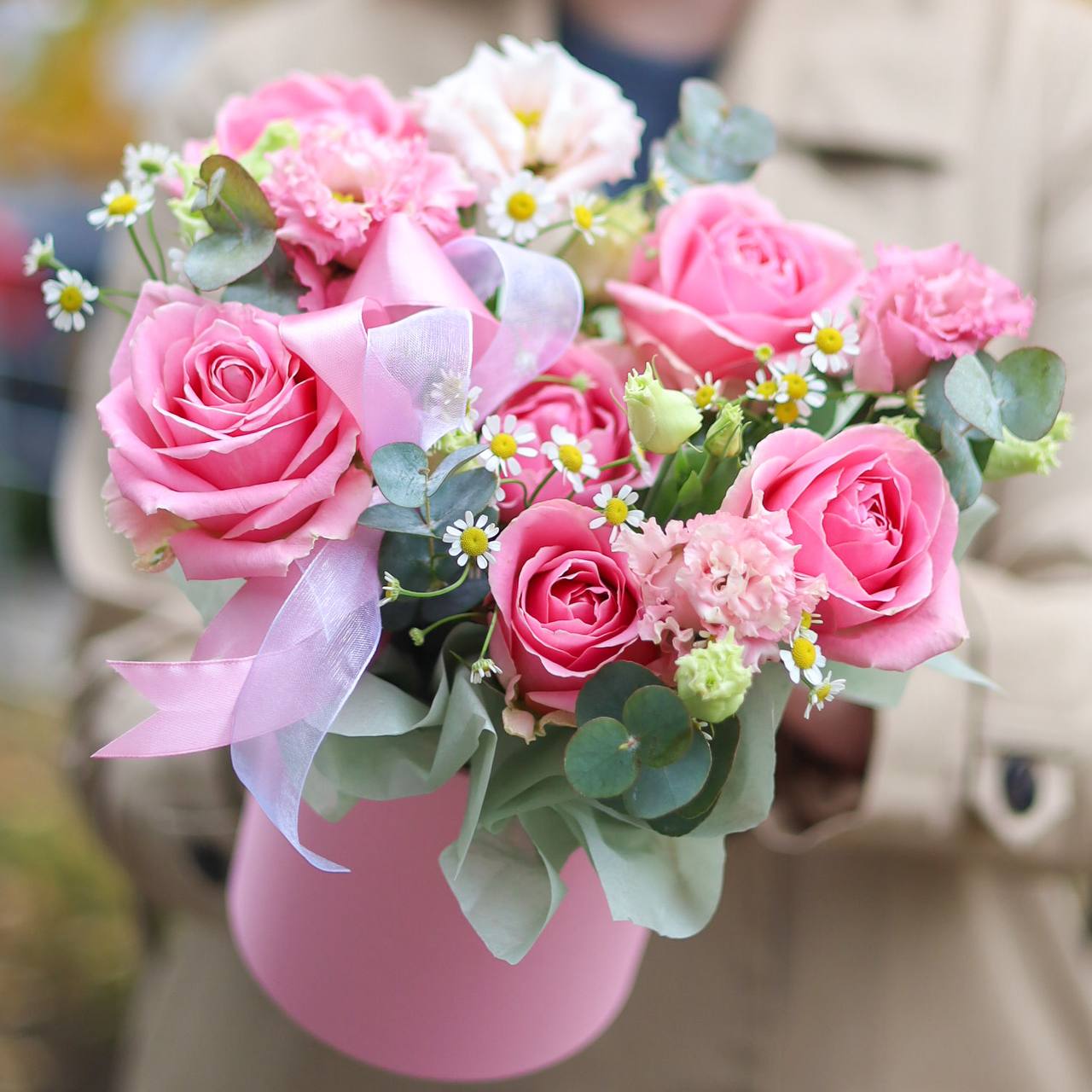 Композиция роз, ароматных ромашек, ажурной эустомы и эвкалипта в шляпной коробке.