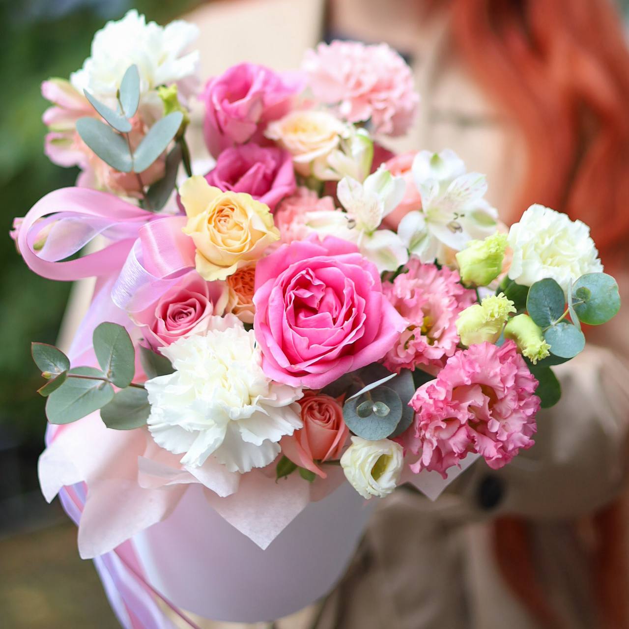 Композиция роз, ажурной эустомы, стойких диантусов, альстромерии и душистого эвкалипта в шляпной коробке.