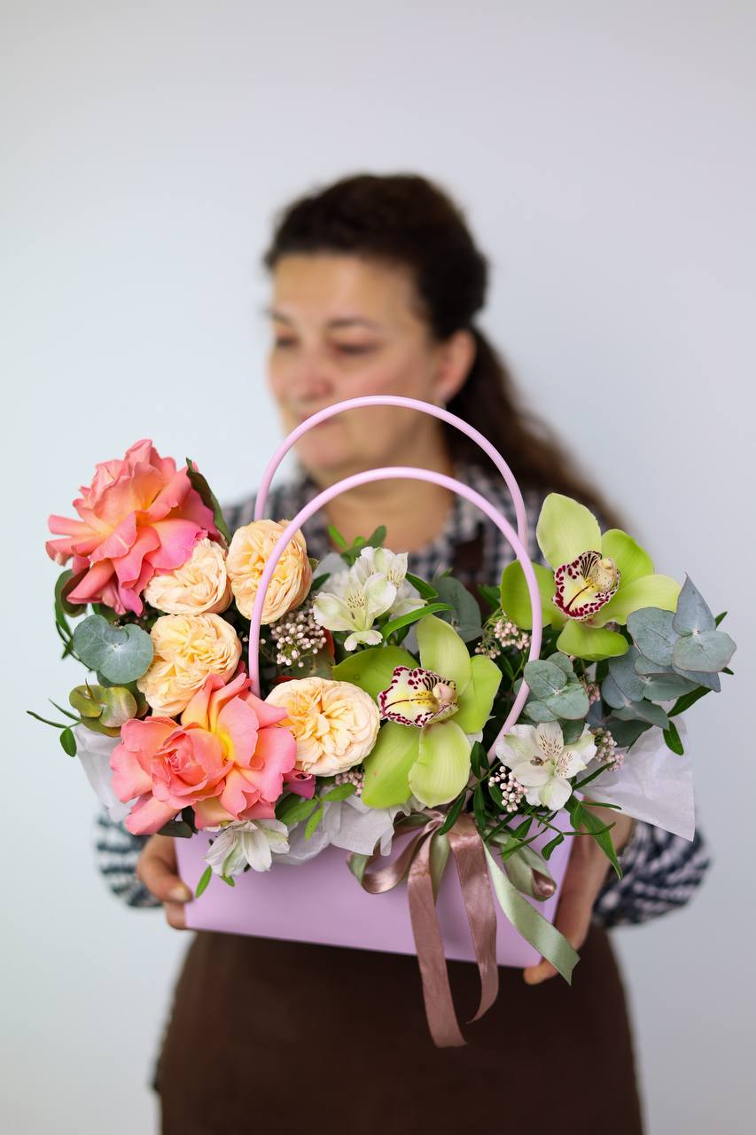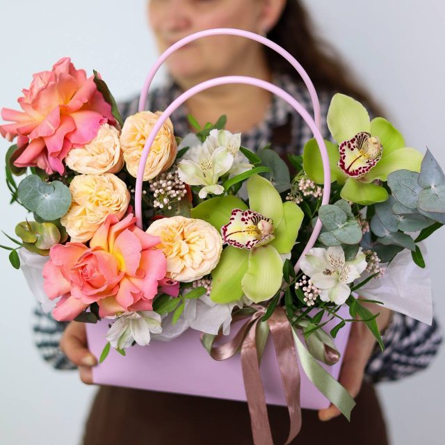 Композиция французских роз, орхидей, кустовых роз, альстромерии и эвкалипта в сумочке.