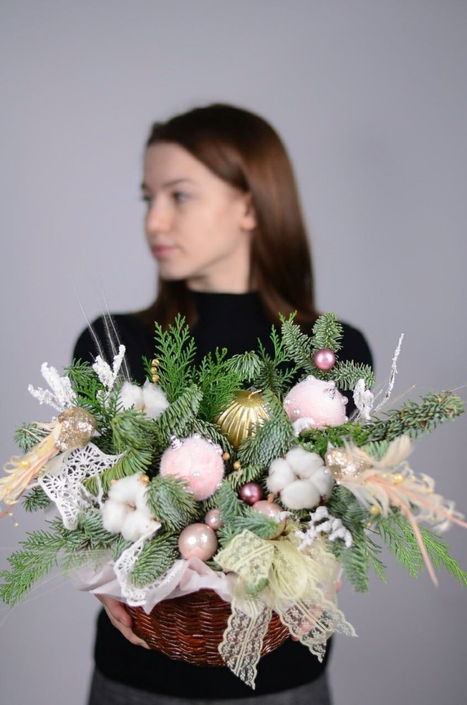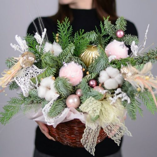 Нежная композиция со свечей, хлопком, датской елью, ёлочными игрушками.