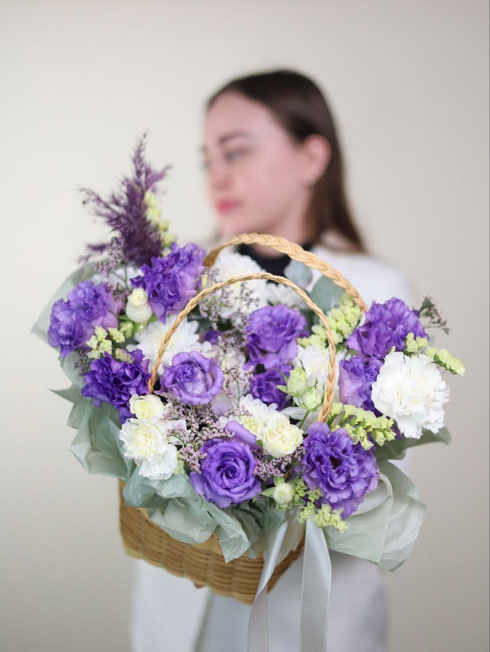 Корзинка с ажурной эустомой, стойким диантусом, лимониумом и статицей.