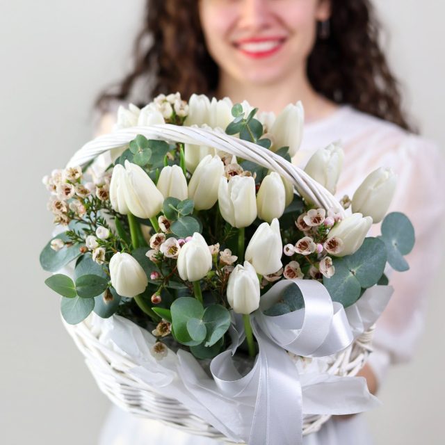 Красивая композиция из 25-ти белоснежных тюльпанов с ароматным эвкалиптом и хамелациумом в плетеной корзинке.