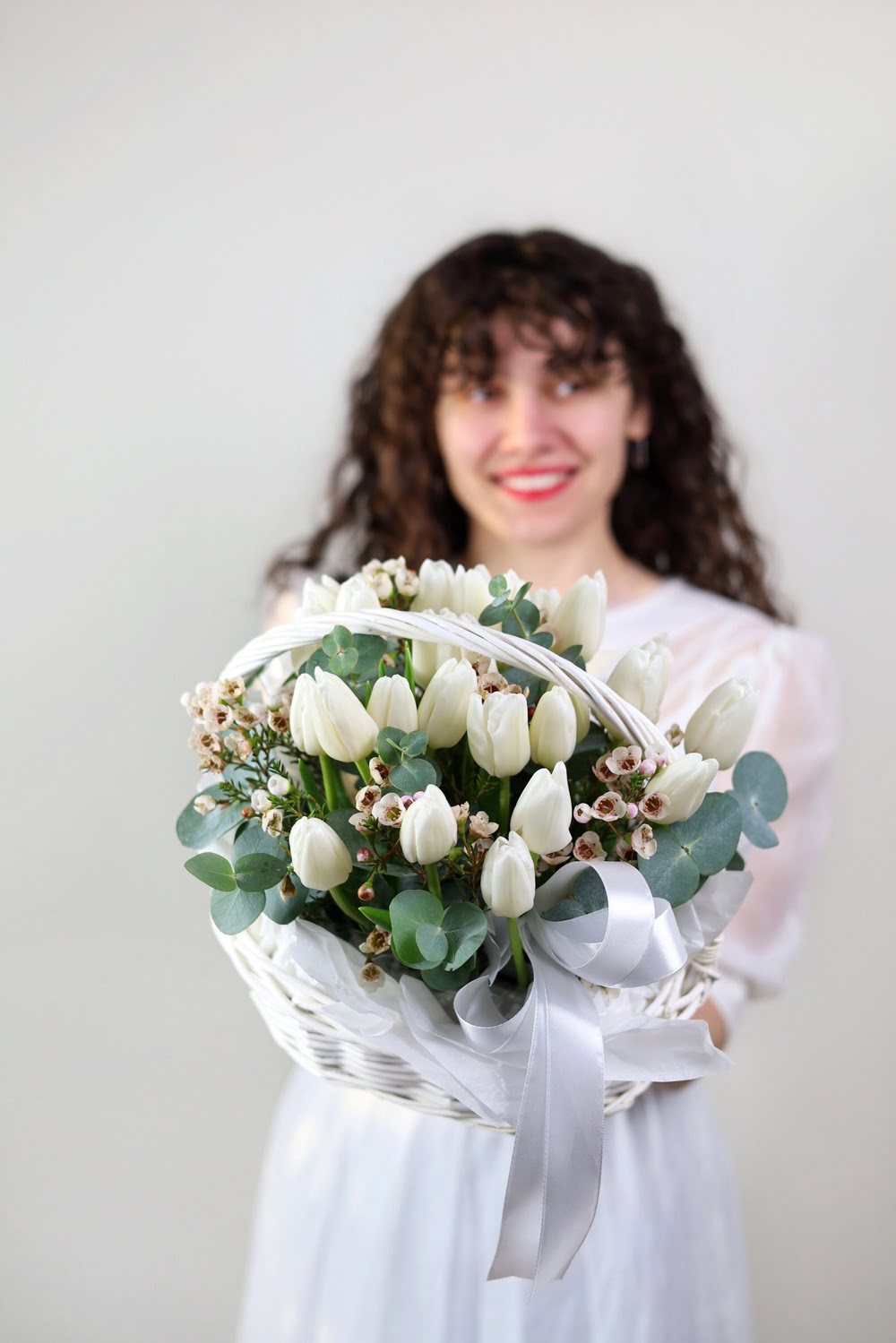 Корзинка белых тюльпанов с ароматной зеленью (25)