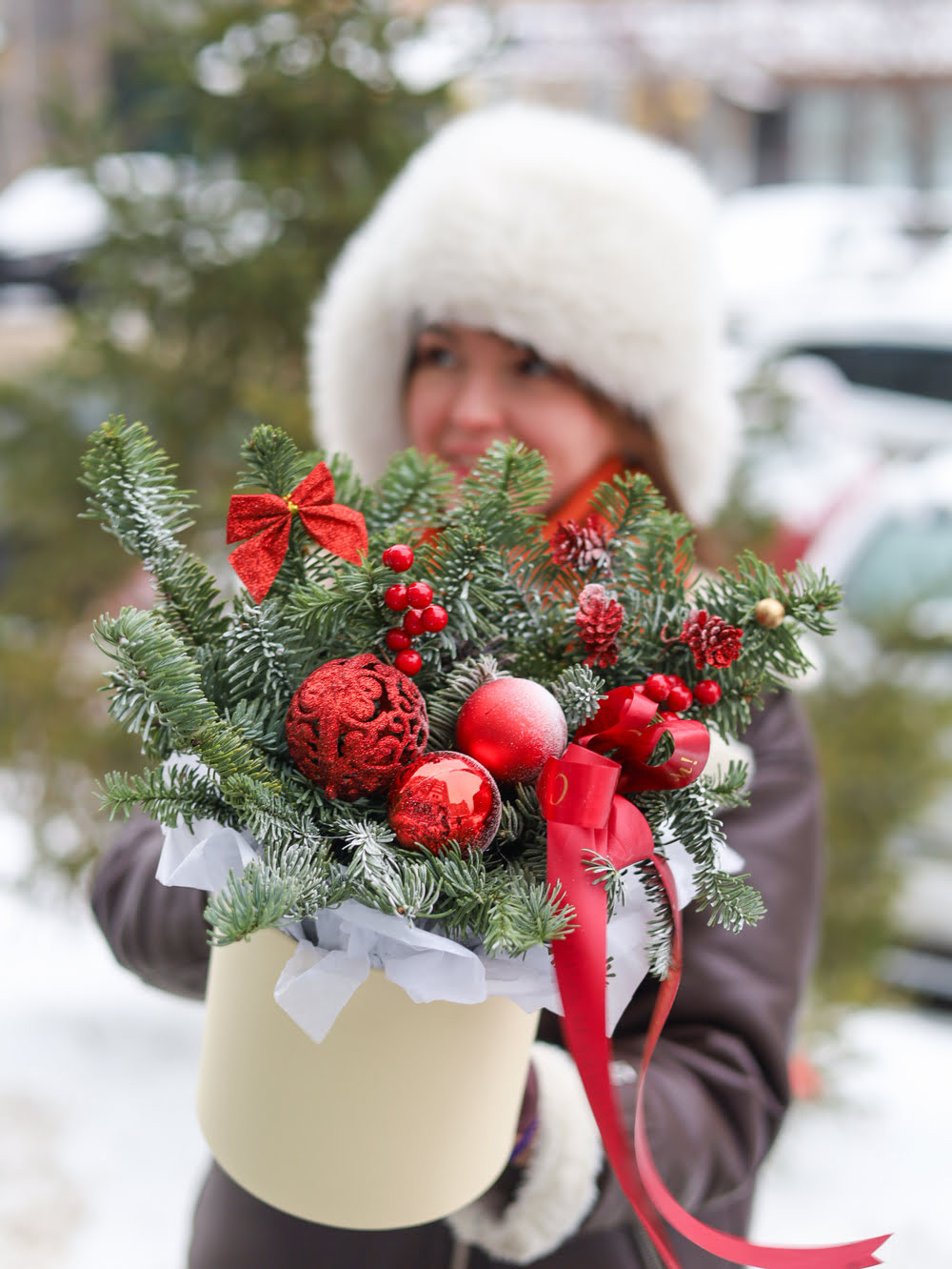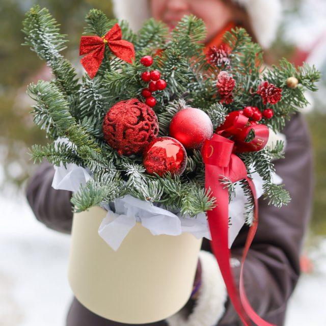 Состав: ель нобилис, елочные игрушки, шишки.