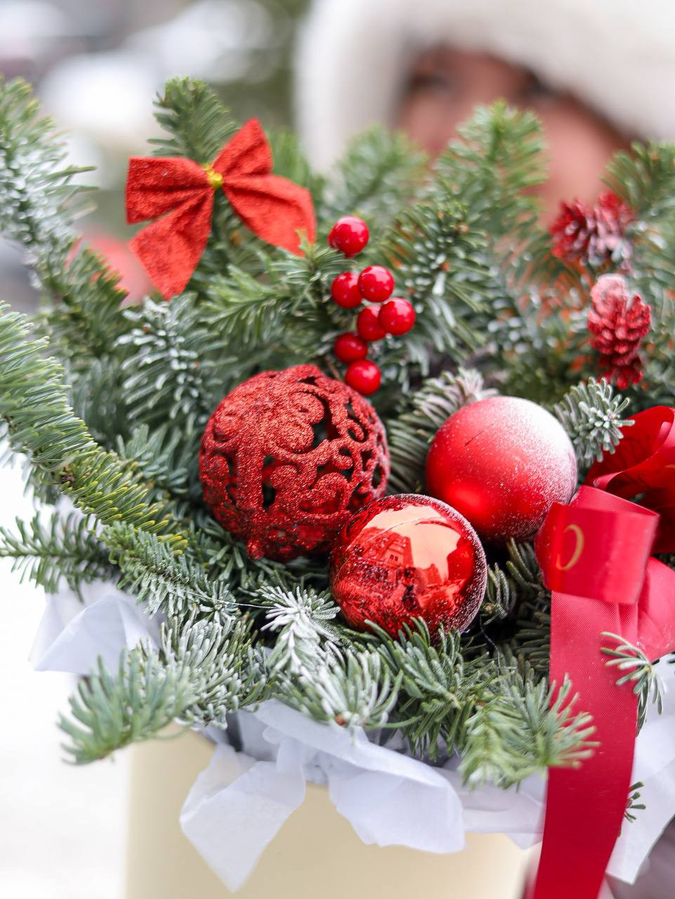 Стильная новогодняя композиция с декором в красной гамме.