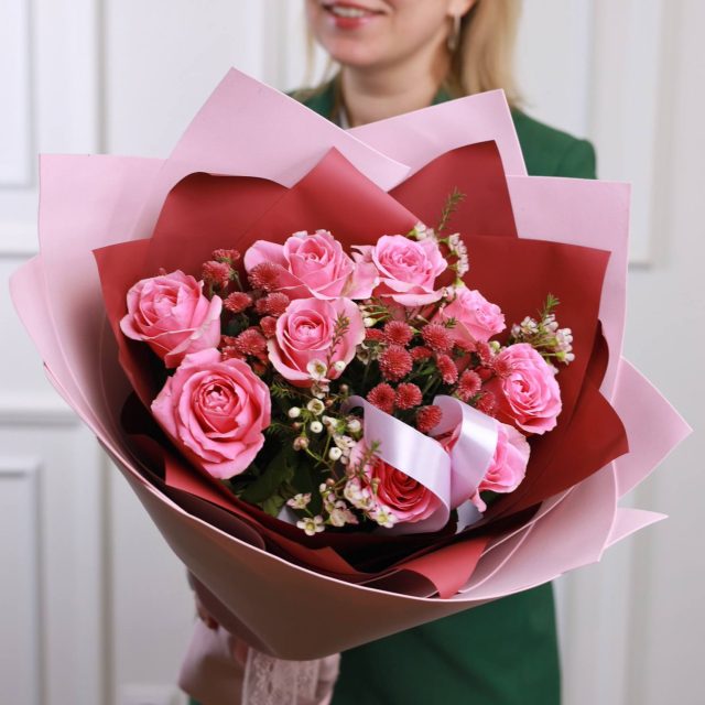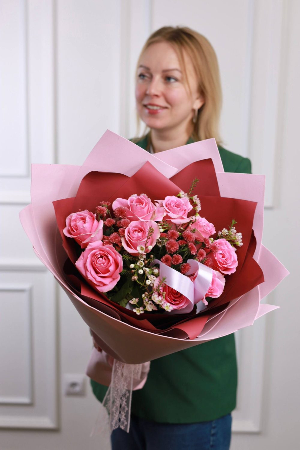 В составе: одноголовые розы, хаммелациум, хризантема сантини