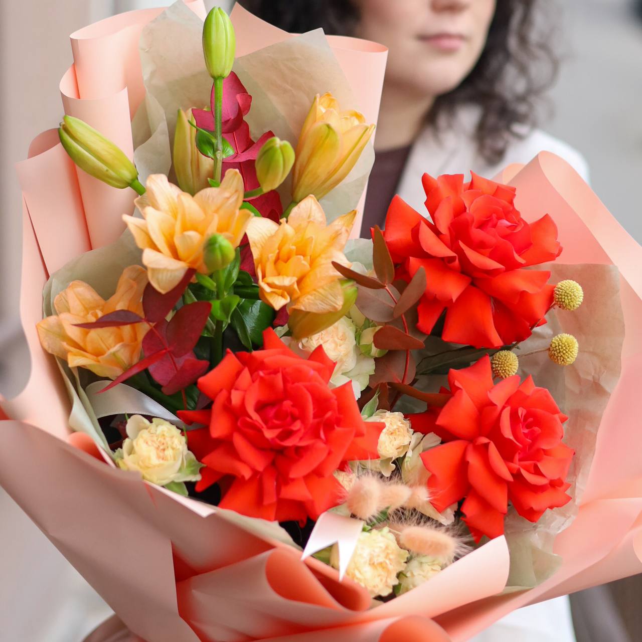Букет лилий, французских роз, кустовых роз, краспедии, лагуруса и зелени в оформлении.