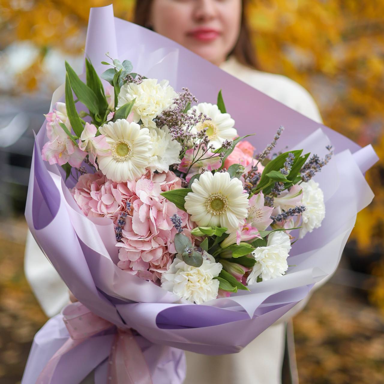 Состав: пышная гортензия, герберы, стойкая альстромерия и диантусы, лаванда, лимониум и эвкалипт.